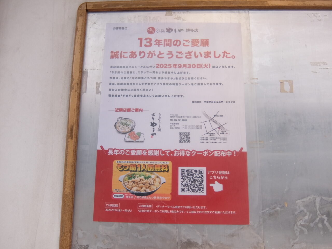 2025年9月30日昼過ぎに博多活憩通りを通っていると、連日行列ができる「博多もつ鍋やまや 博多店」の入り口付近に気になる張り紙を発見!