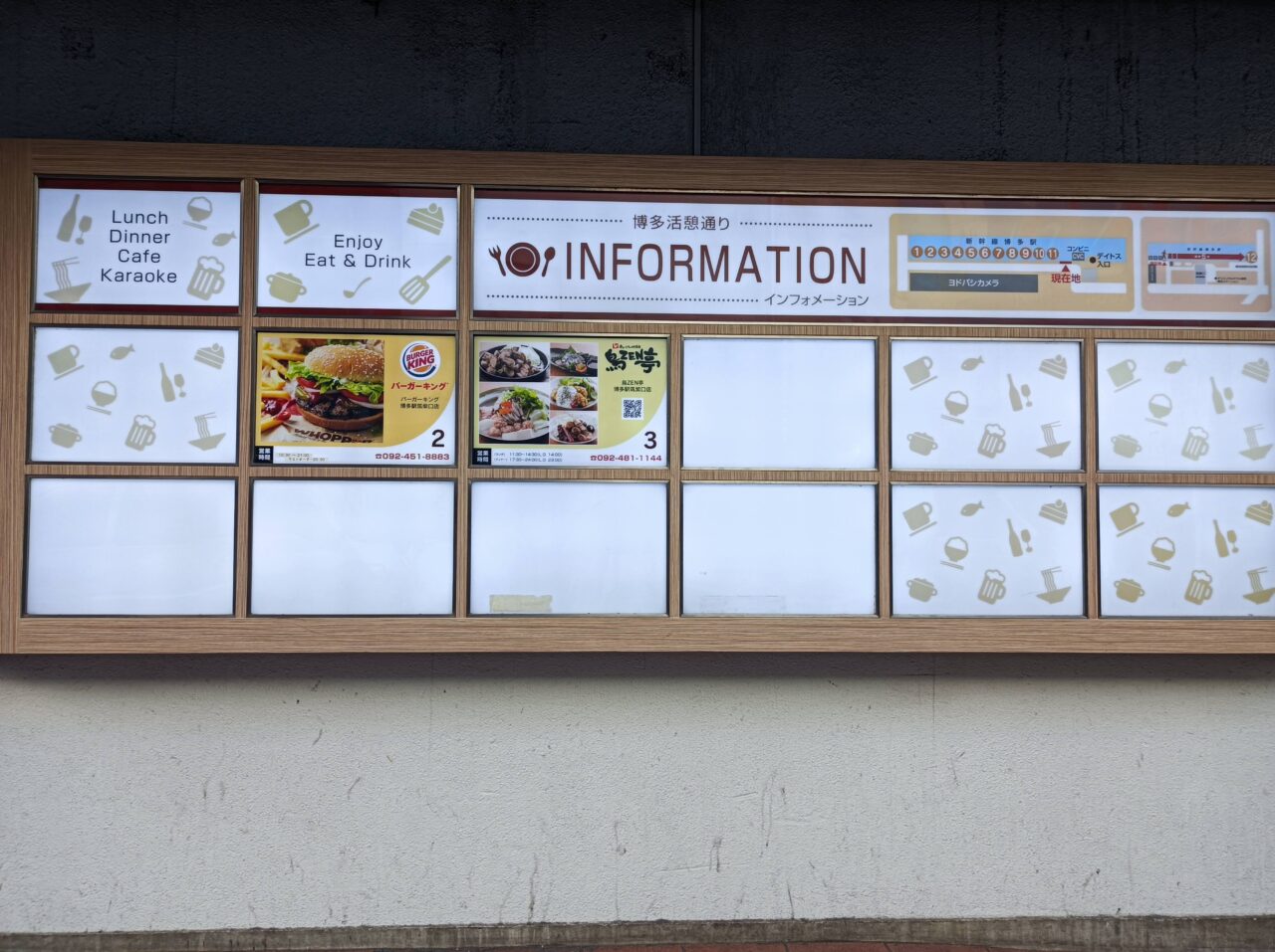 博多活憩通りで営業しているお店は、「バーガーキング 博多駅筑紫口店」と「鳥ZEN亭 博多筑紫口店」の2店舗のみとなりました。