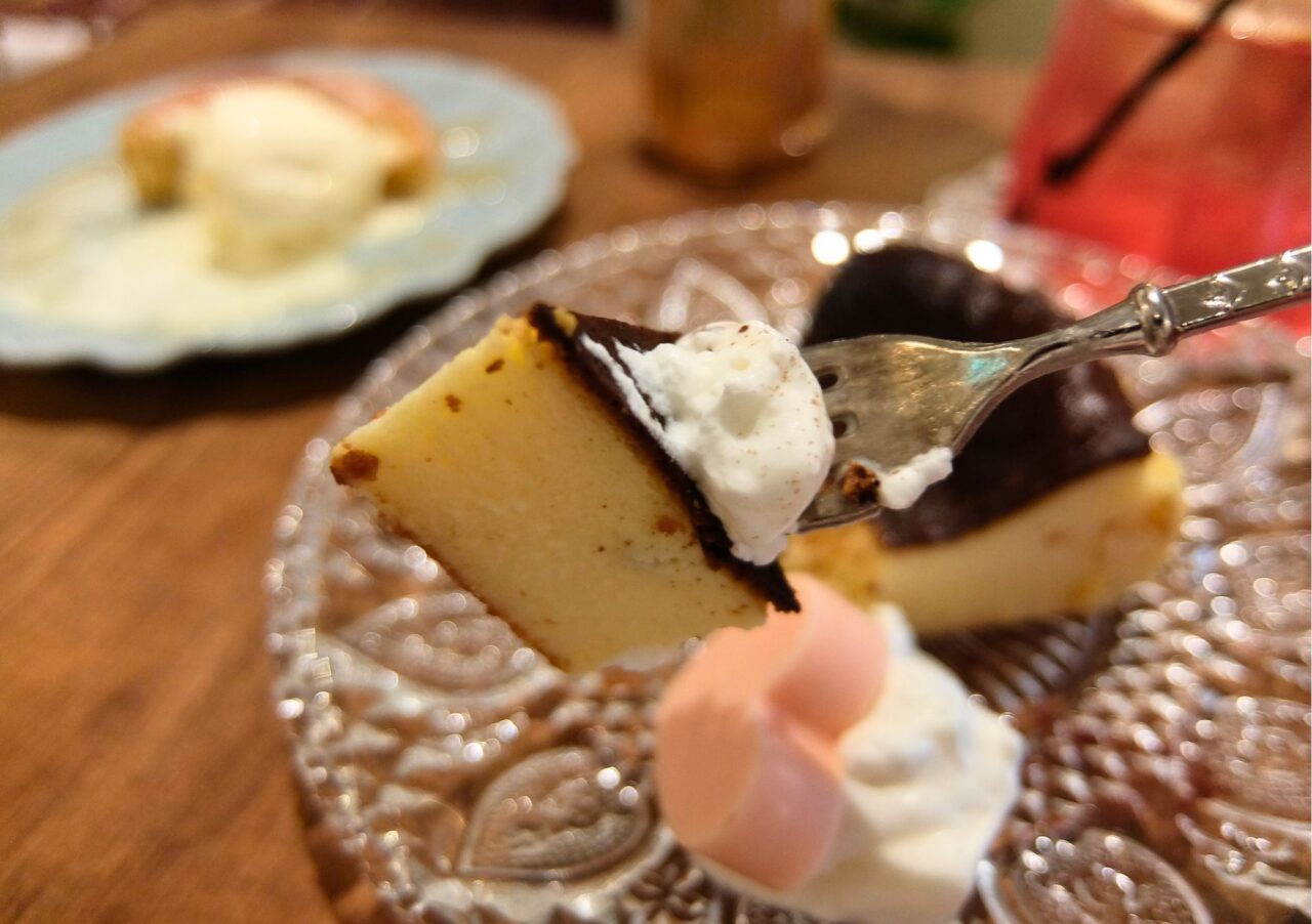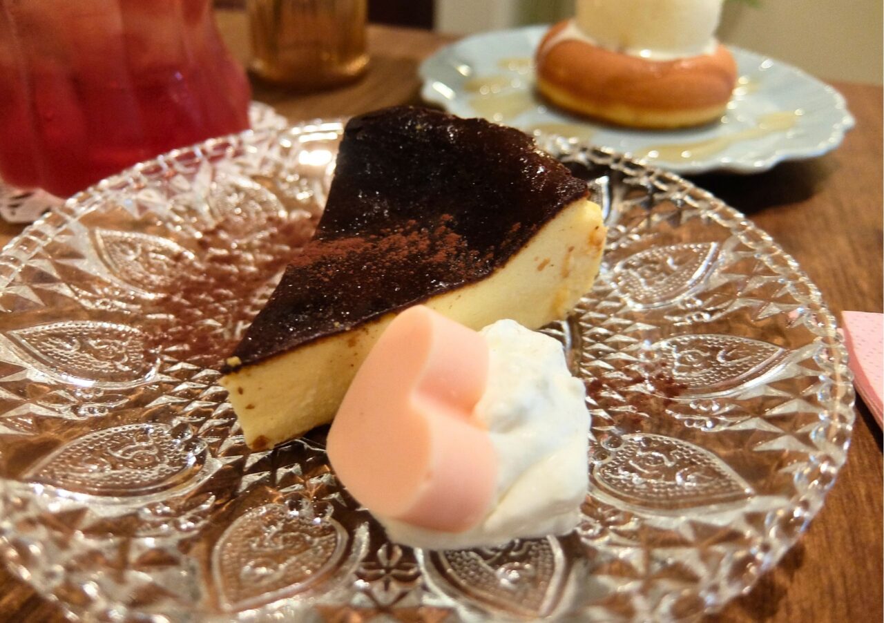 しっかりと付いた黒色の焦げ目が美しいバスクチーズケーキに、ちょこんとのったハートのチョコレートが可愛い!食べてみると、口どけなめらか。思っていたよりも甘さ控えめですが、生クリームをつけていただくと甘さとまろやかさがUPしておいしい!
