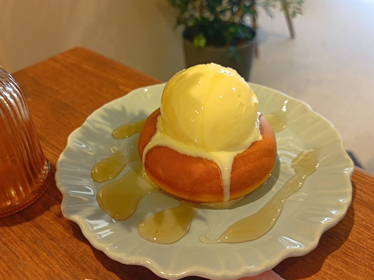 糟屋郡粕屋町にある「パティスリー マルジョレーヌ」で人気の「KAS焼ドーナツ」の上に、バニラアイスがのっています。