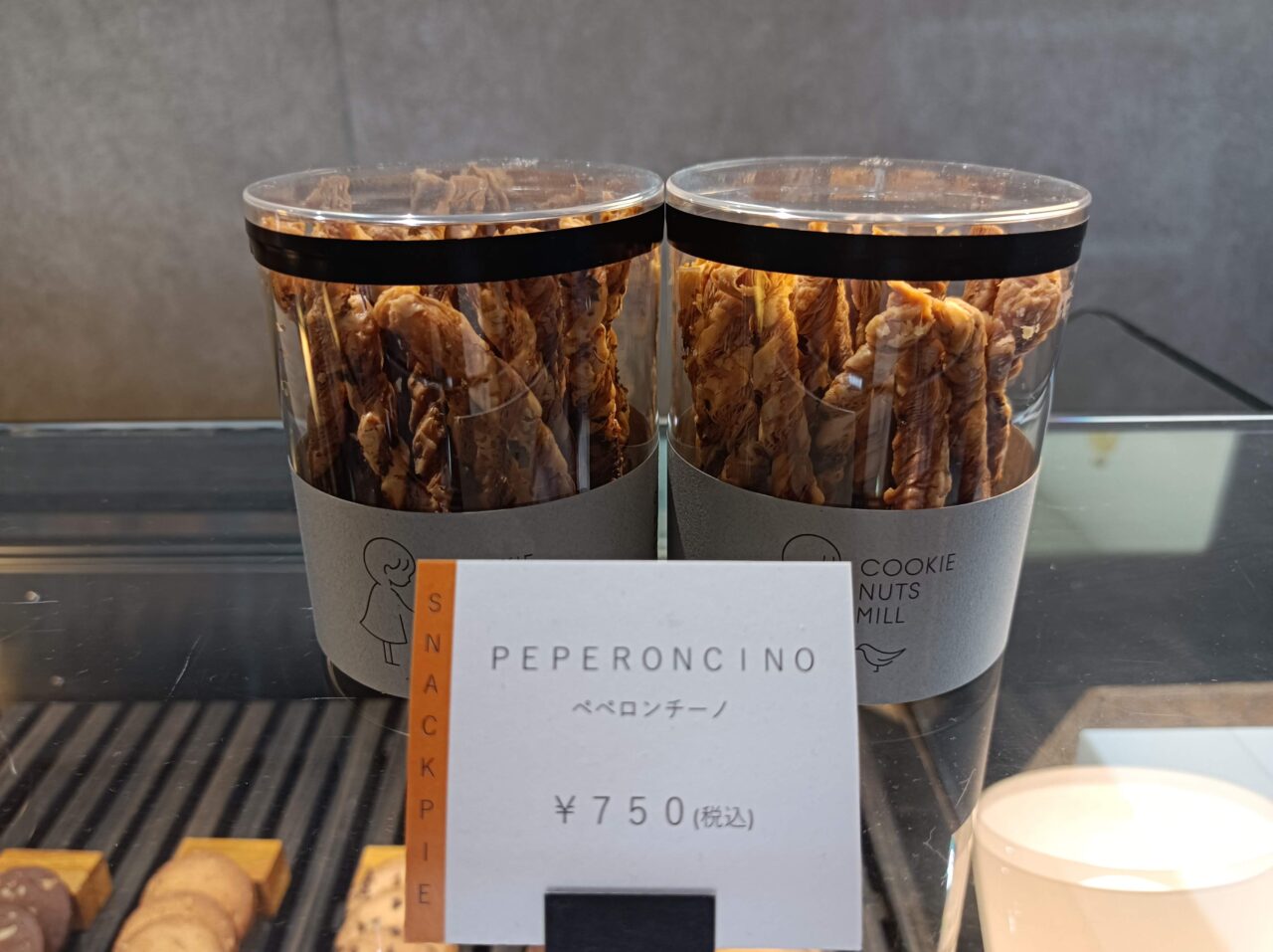 晩酌にぴったりなおつまみ系焼き菓子も販売されています。パイ生地を一口サイズのスティック状にして焼きあげた「スティックパイ」(1個、750円(税込))は、シンプルですが癖になる味わい「ペペロンチーノ」や数種類のスパイスとハーブ、チーズをまぶした「ブラックソルト」など、6種類の味が販売されています。