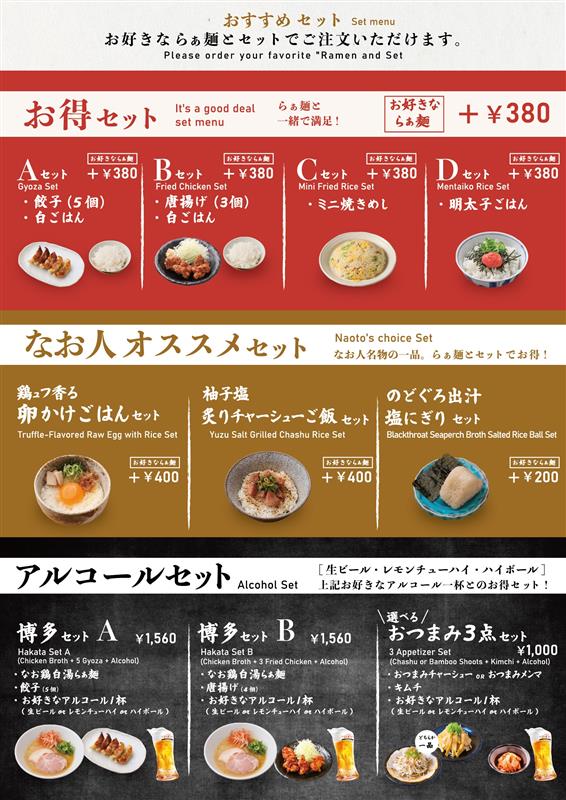 「博多非豚骨 なお人」では、単品以外にも終日利用できる、「お得セット」「なお人オススメセット」「アルコールセット」があります。