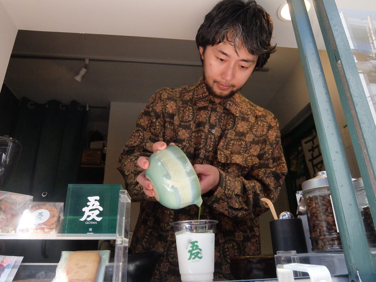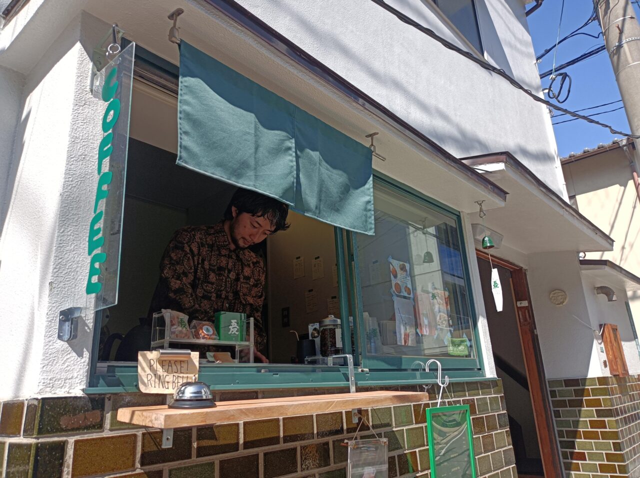 「GOTAN coffee」は、美容室を併設したカフェ。道に面した出窓部分がテイクアウト専門で、その奥に美容室があります。緑色の暖簾が目印です。