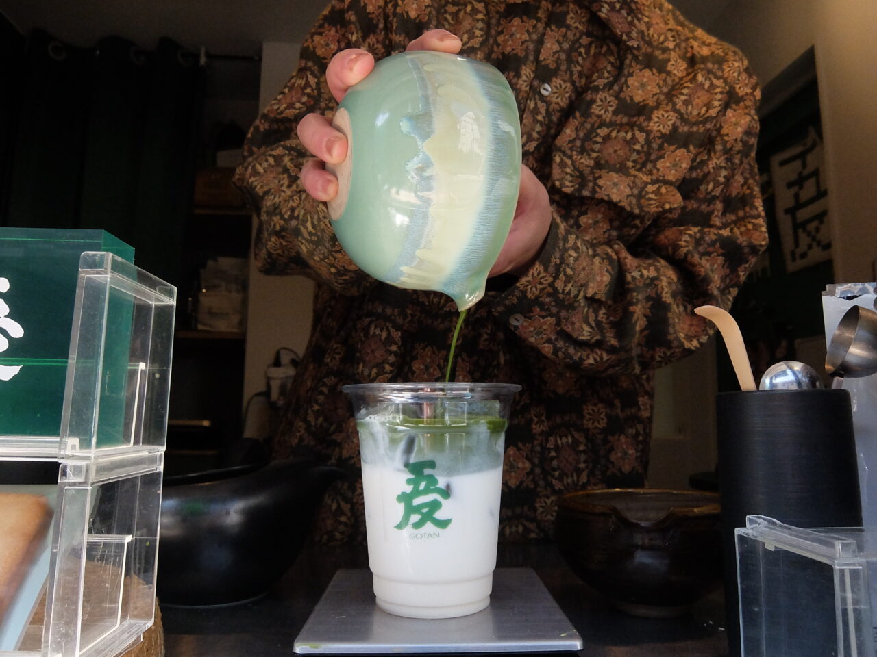 注文を受けてから、一杯一杯、茶筅(ちゃせん)で点てて作られるこだわりのラテ。