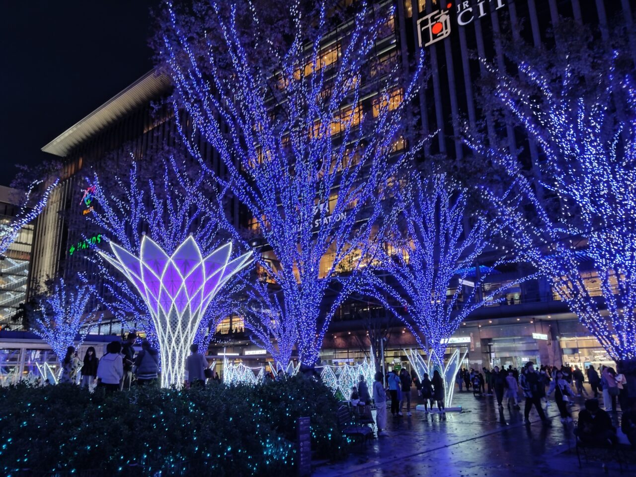 正面入り口にある「光のゲート」や博多駅前広場の約30本の樹木が青い光で彩られた「光の森」など、壮大な64万球のイルミネーションがJR博多駅前広場を彩ります。