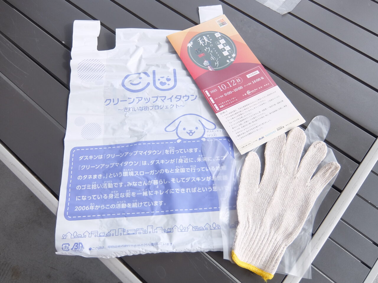 今回は株式会社ダスキンが全国で行っている社会貢献活動 「クリーンアップマイタウン」との共同開催イベントとなっており、受付した際に配布された軍手とゴミ袋を持って、いざ!スタート!
