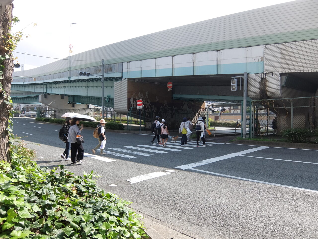 福岡都市高速、国道3号線、御笠川が一望できる大浜河畔通りを歩き、