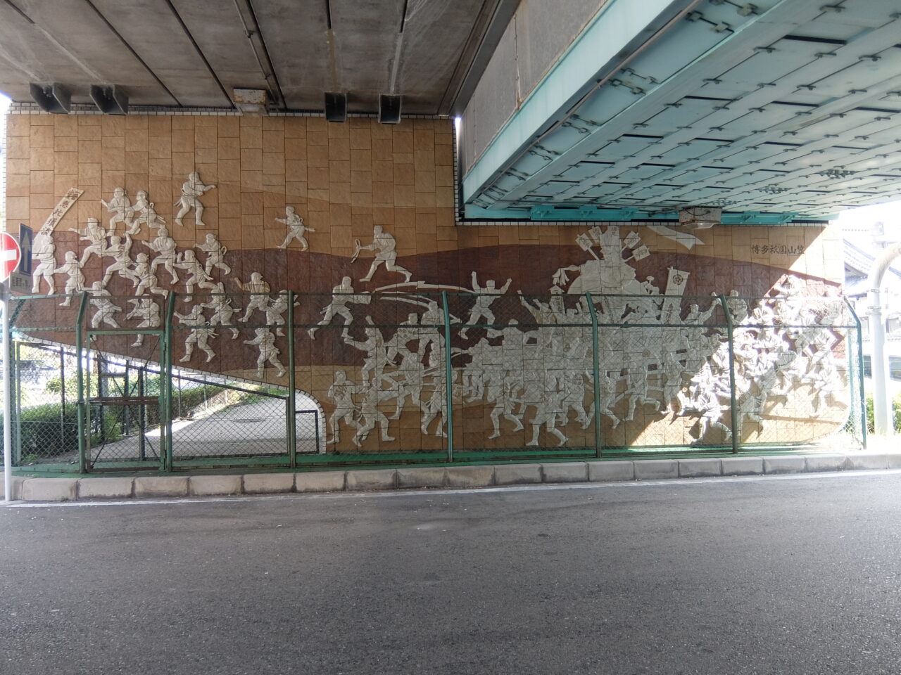 スタートしてから約1.5㎞。福岡都市高速呉服町ランプの橋脚を潜ると、その壁に恵比須流の勇壮な山笠レリーフが飾られています。