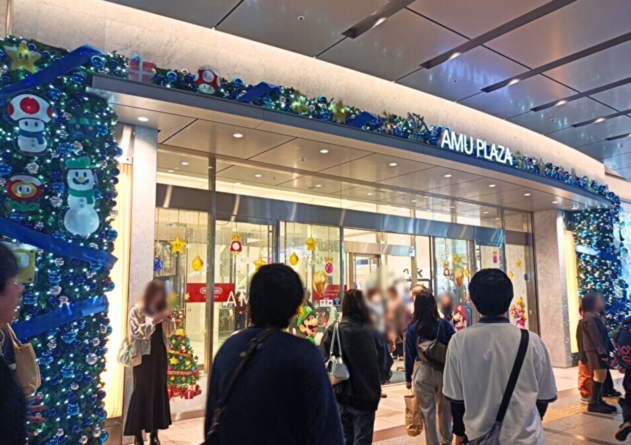 アミュプラザ博多1階、JR博多駅博多口近くのエントランスには、クリスマスのオーナメントにホリデーデザインの「スーパーマリオ」のキャラクターやアイテムが飾られています。