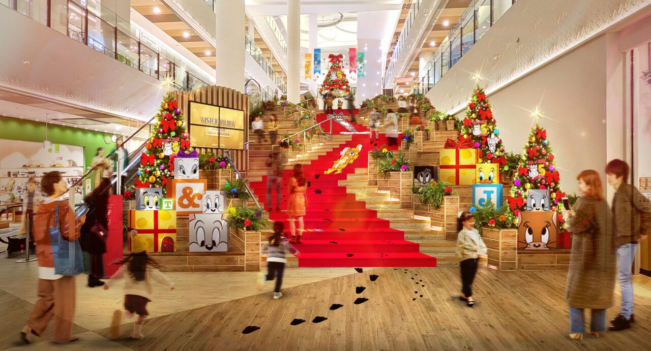 MARK IS 福岡ももちの中央、1階と2階をつなぐ「おおかいだん」には、クリスマスの華やかな空間で繰り広げられるトムとジェリーのドタバタ・セレブレーション劇場が登場!