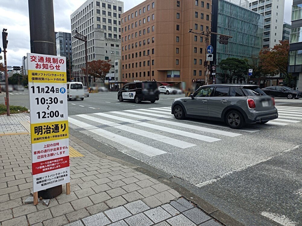 博多区土居通り交差点付近(東京海上日動ビル前)~中央区平和台交差点付近(読売舞鶴公園ビル前)の約2.3kmで、長時間の交通規制が行われます。