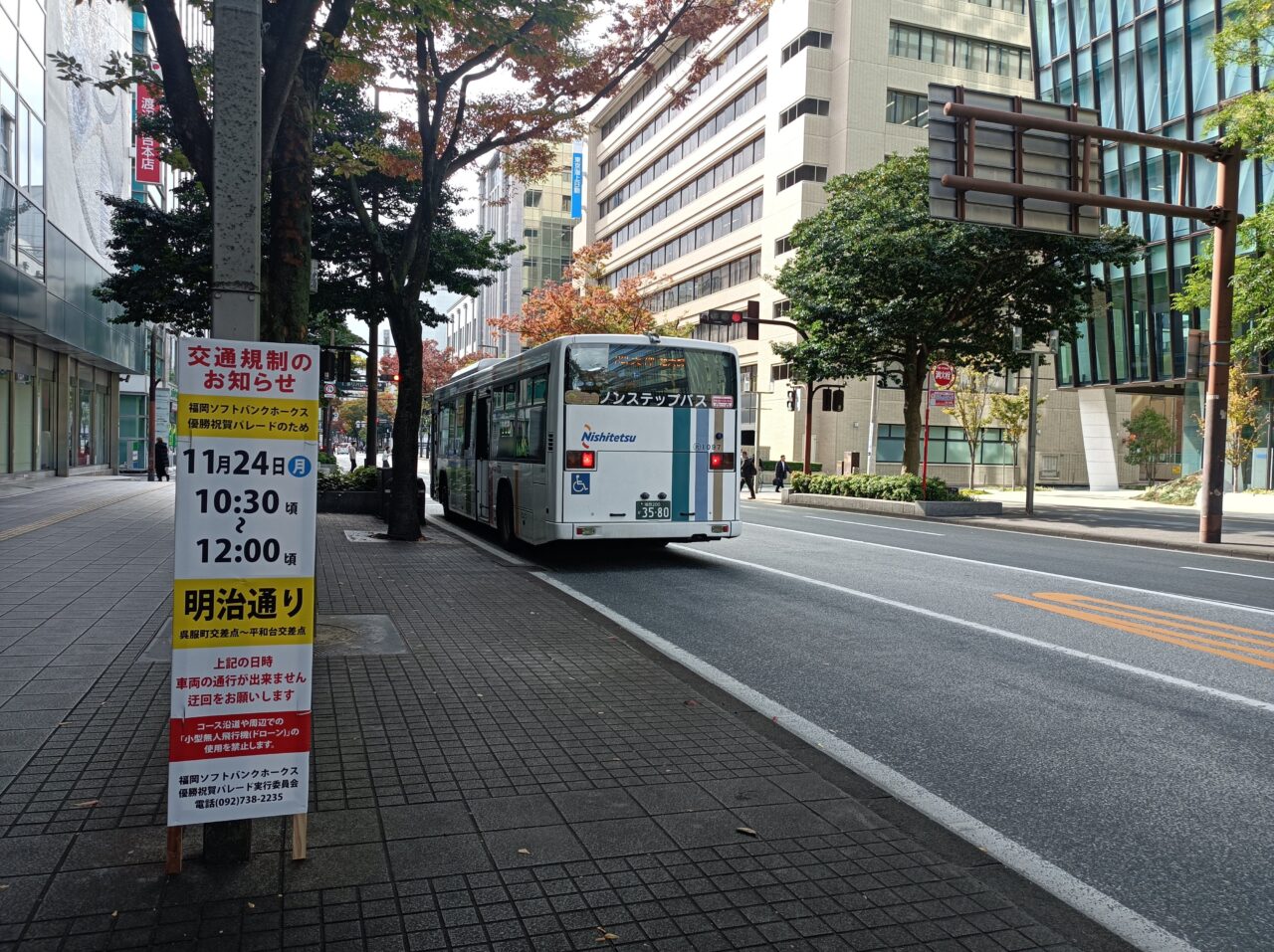 福岡ソフトバンクホークス優勝祝賀パレード開催に伴い、明治通りの呉服町交差点~平和台交差点と、明治通りに交差する渡辺通りの一部が、10時30分~12時頃まで交通規制が行われます。