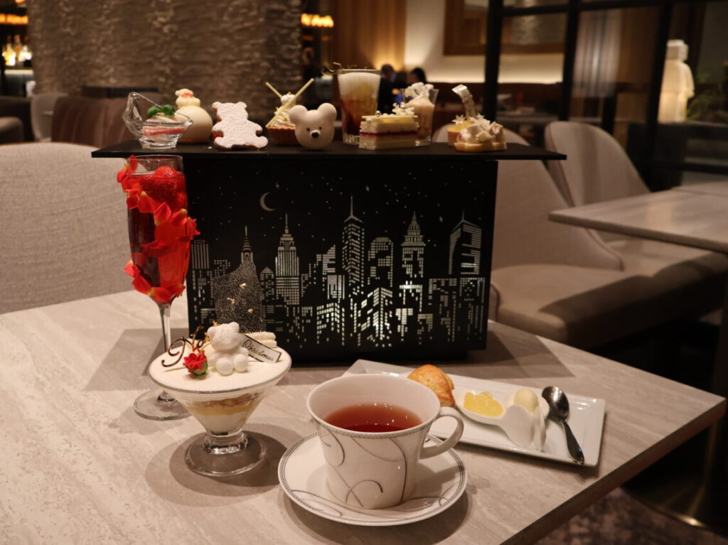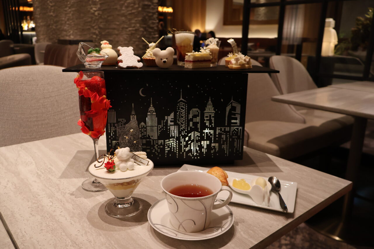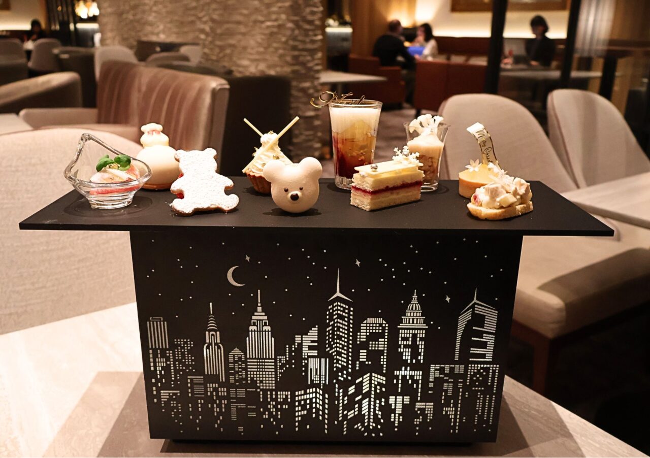 幻想的な冬景色をより際立たせる、マンハッタンの夜景がライトで映し出されたスタンドに、セイボリーとスイーツが美しく並べられていました。