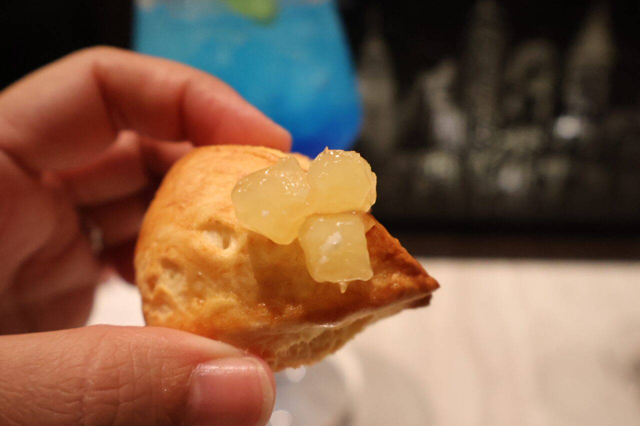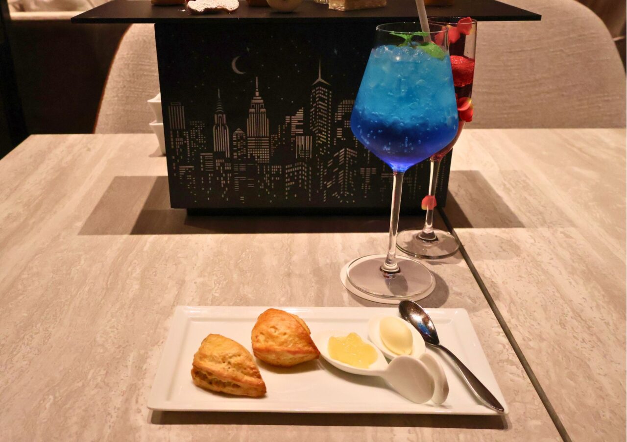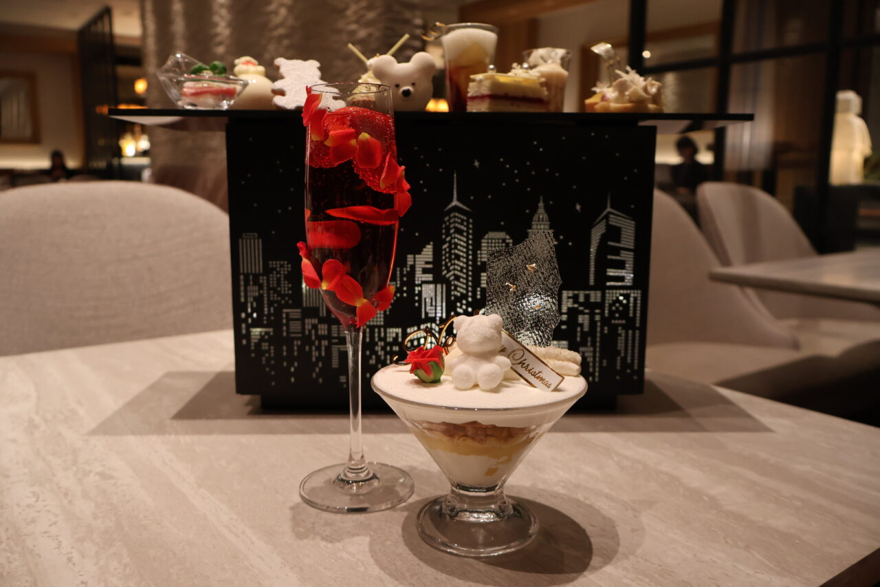 幻想的な冬景色をより際立たせる、マンハッタンの夜景がライトで映し出されたスタンドに、セイボリーとスイーツが美しく並べられていました。