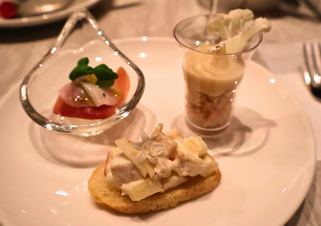 ほのかな甘みと香りが上品で、驚くほどなめらかなムースが魅力の「カリフラワーのスノームース」、軽やかな酸味と塩味のバランスが絶妙な「蕪と生ハムのカプレーゼ」、りんごのフルーティーな香りがアクセントの「鶏胸肉とりんごのホワイトサラダ」。