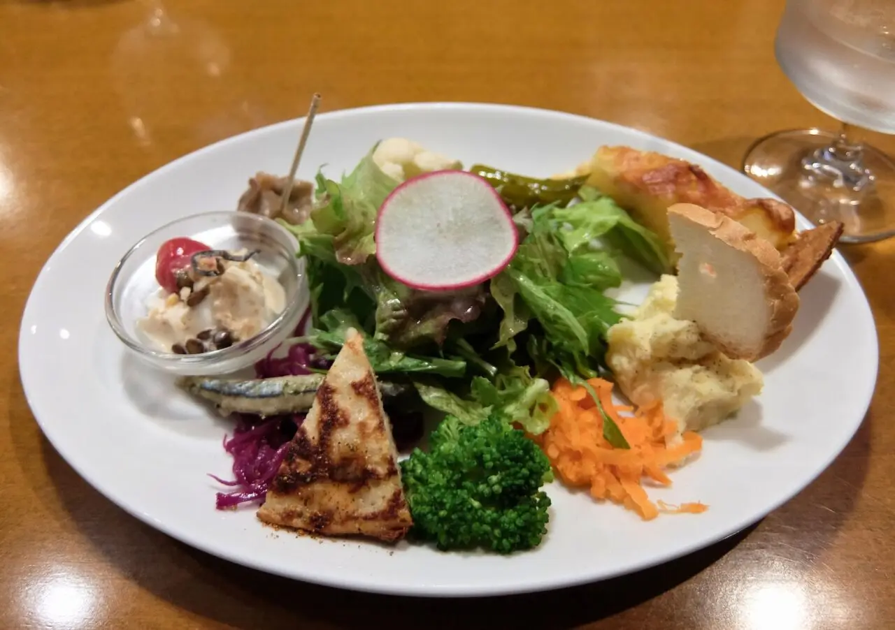 前菜サラダは、サラダやラぺ、キッシュなど、彩りキレイでボリューム満点。