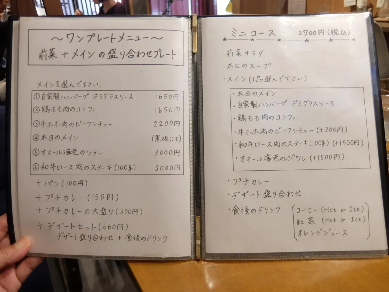 メニューは、昼も夜と同じで、サラダやアヒージョ、ビーフシチュー、ステーキなどの単品料理に加えて、ワンプレートやミニコース、本格的なA~Cコースまで多彩に揃っています。どれにしようか迷っちゃいますね。