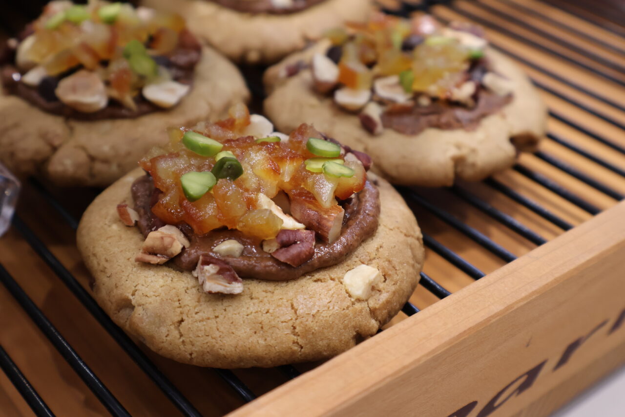 「ナッツプラリネクッキー」は、香ばしいプラリネクリームの上に色々なナッツとチョコチップが飾られて華やかです。しっとりとしたクッキー生地とナッツの食感に加え、煮込まれた香り高いオレンジピールが爽やかなアクセントになっていて、一度食べたら忘れられない味わいです。