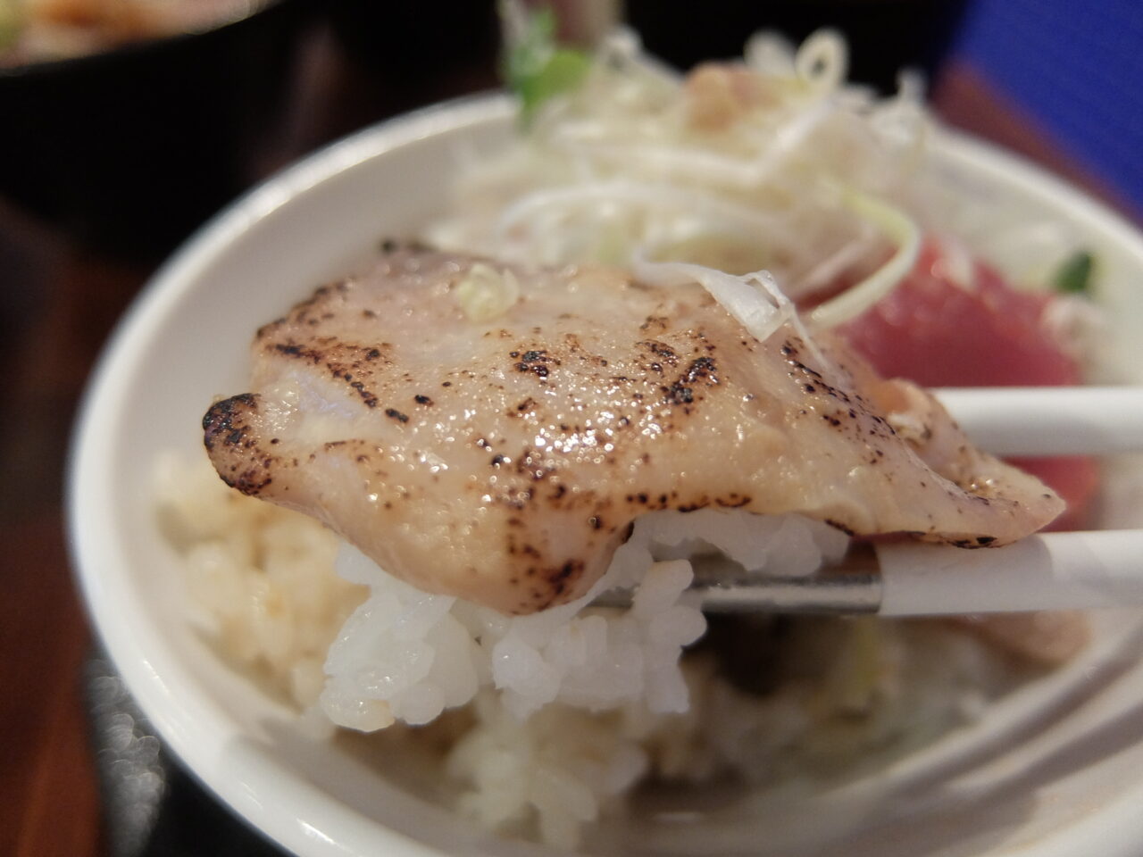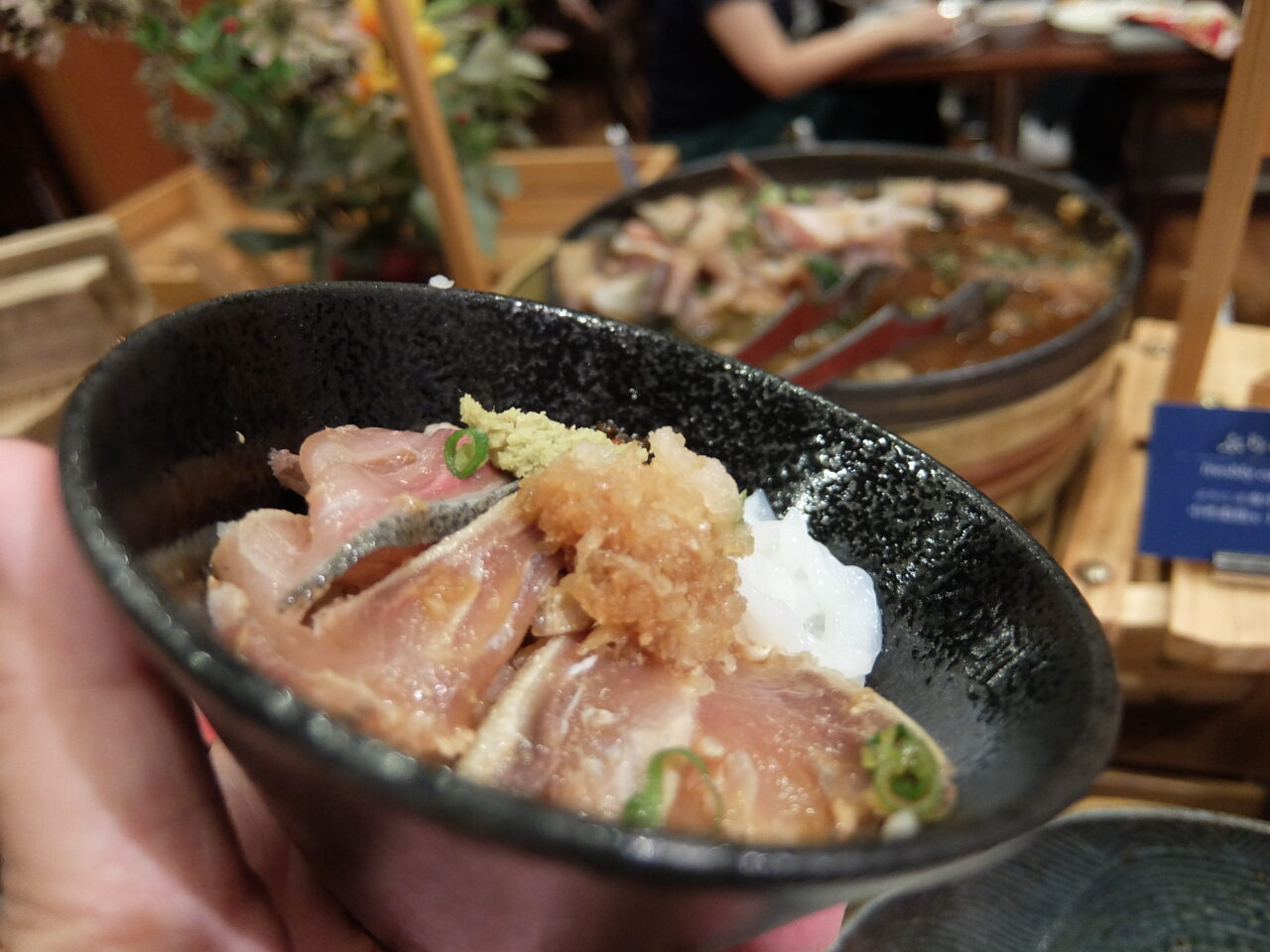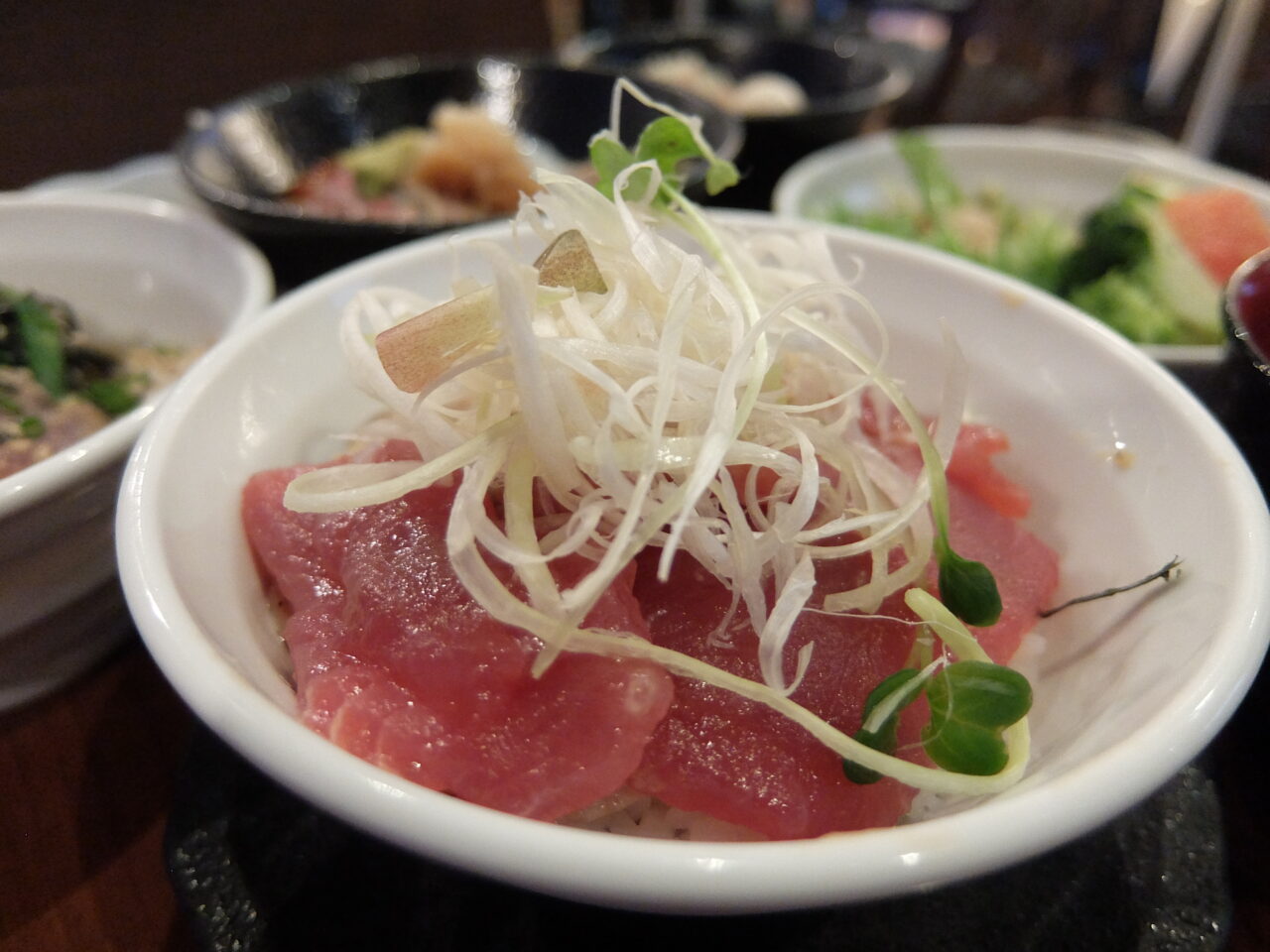 脂の乗り切った香ばしく炙り上げられた寒ブリの切り身と、マグロのツヤのある赤い身のコントラストが鮮やか。視覚からも食欲をそそります。