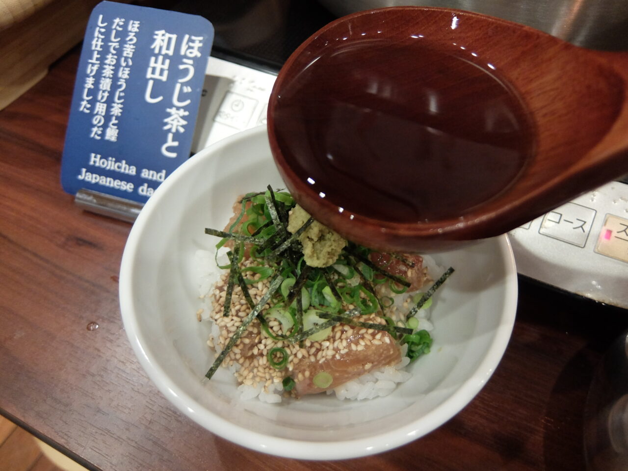 寒ブリ漬けをそのまま食べても十分おいしいのですが、香ばしい「ほうじ茶和だし」を寒ブリ漬けにそそぐと、魚の色がさっと美しく変化する様は、目にも鮮やかです。