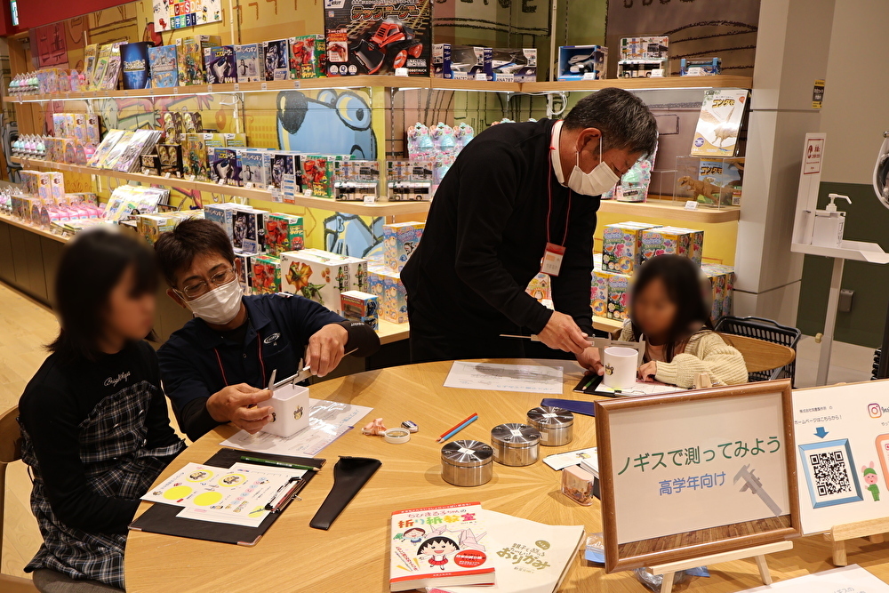 3つ目に、物の外径、内径、深さ、段差などを測定できる測定工具「ノギス」を使った体験です。コップの口径やボルトの長さなどを計測することに挑戦しました。