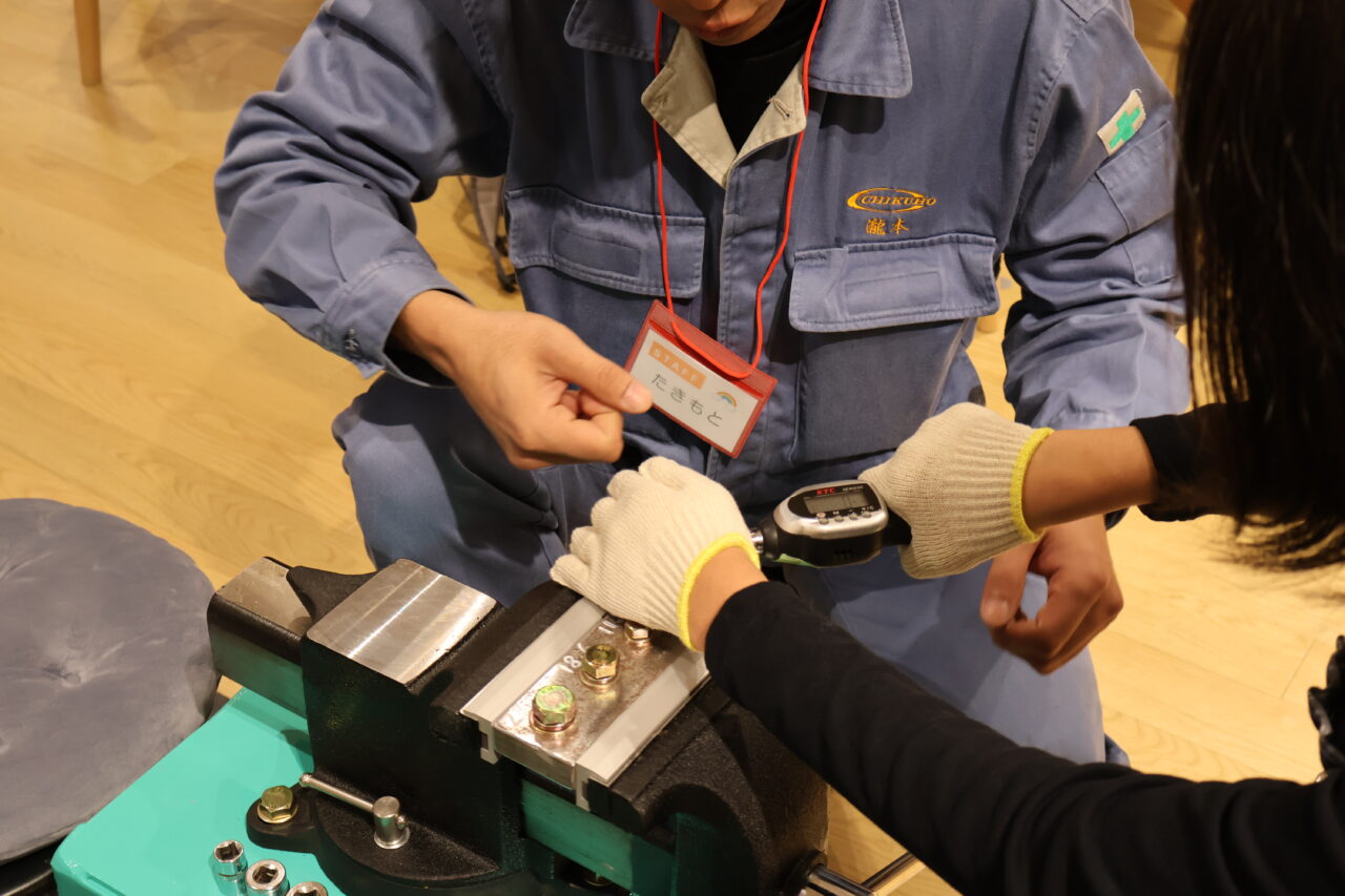 見たことのないデジタルトルクレンチや専門的な説明に最初は戸惑ったようですが、エンジニアの方と一緒にネジ締めに挑戦。