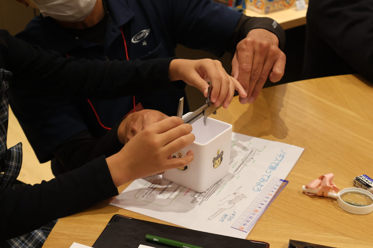 エンジニアさんの説明に真剣な眼差しの子ども達。普段使い慣れた定規とは違い、ノギスでミリ単位の正確さを求められる作業は勝手が違ったようで、プロの仕事の難しさを肌で感じ取っているようでした。