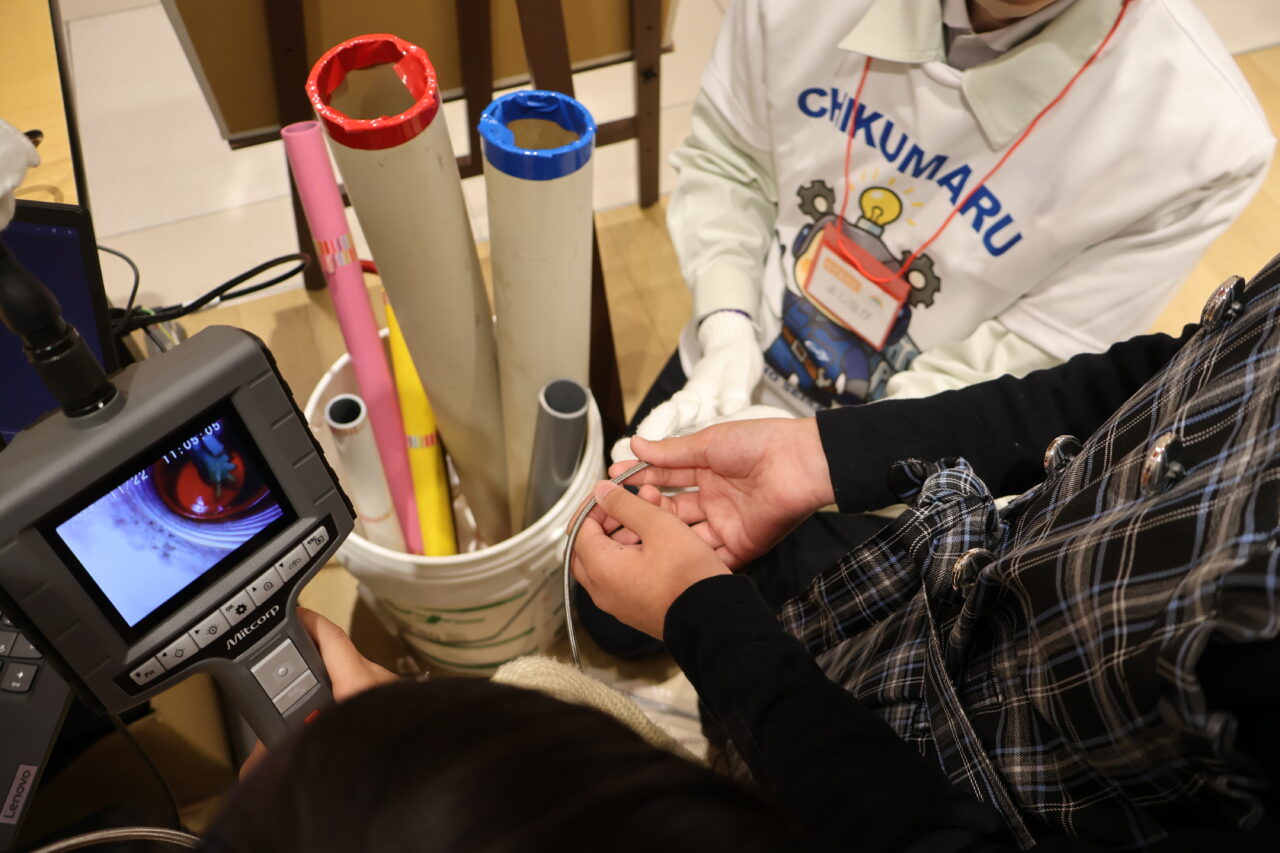 サービスエンジニアが実際に使用する専用スコープを操作して、子どもたちはパイプの中に隠されたモノを見つける作業に挑みました。普段の生活では触れることのない専門的な道具に興味津々でした。