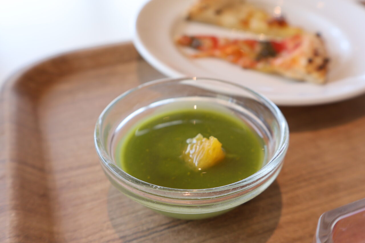 一口食べると、抹茶の爽やかな香りが口いっぱいに広がり、上品な甘さが際立ちます。トッピングされたオレンジの果肉が絶妙なアクセントとなっています。
