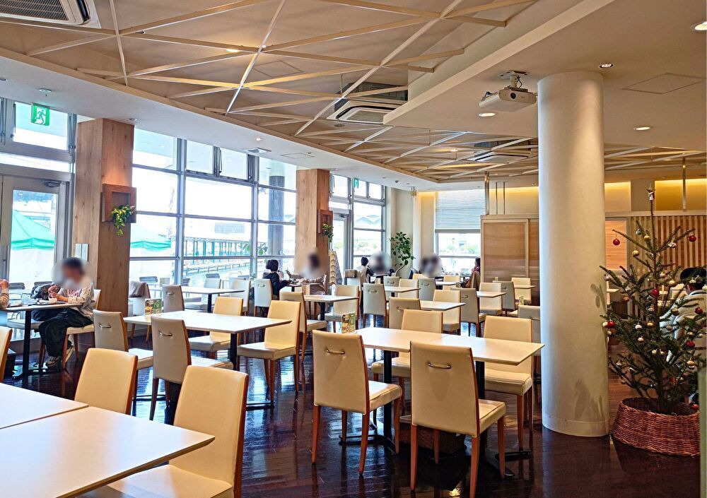 「リタの農園」の店内は、白を基調としたカジュアルモダンなデザインで、広々とした開放感が特徴です。大きな窓からは博多湾の美しい景色を一望できます。2~4名様用のテーブル席を豊富にご用意されているので、友人や家族とはもちろん、お一人様でも気兼ねなく利用いただける雰囲気です。