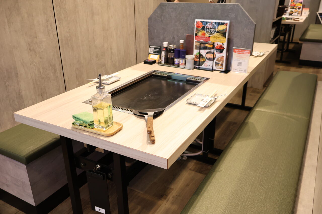 店内は、鉄板を囲むテーブル席が並んでいて、スタッフが目の前で焼き上げてくれるスタイルになっています。もんじゃ焼きを食べたことがない方や作るのに自信がないという方には嬉しいですね。