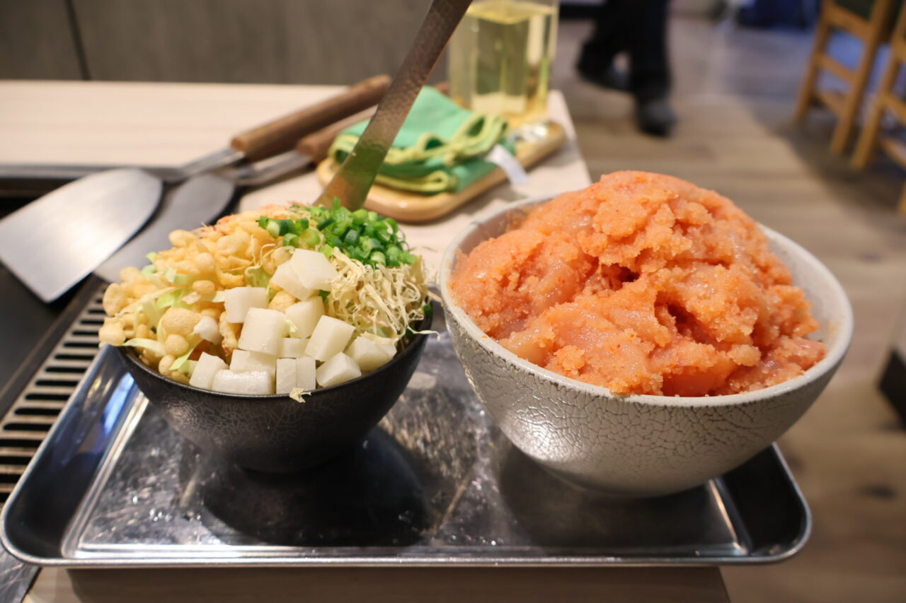 「アガる明太子 明太子かけ放題もんじゃ」(1,969円(税込))は、テーブルに運ばれてきたのは、ドーン!と器に入った大量の明太子にビックリ!