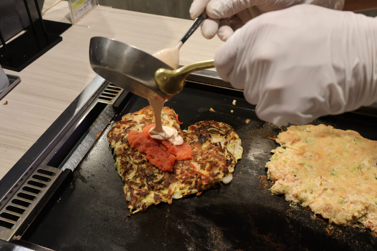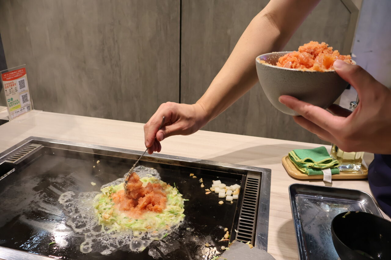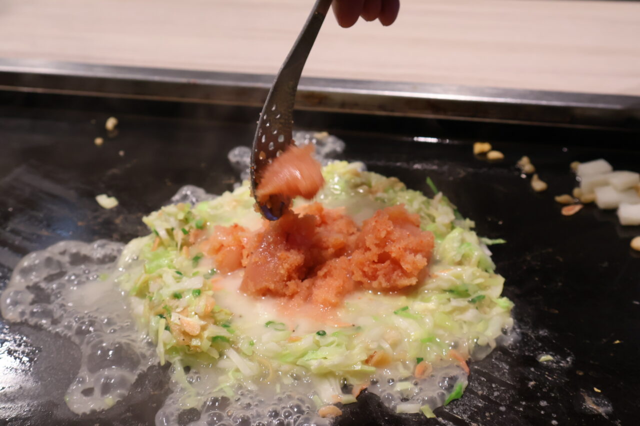 両国発祥のちゃんこだしをベースにしたもんじゃ生地の上に、スタッフの掛け声と共に、明太子をかけていきます。