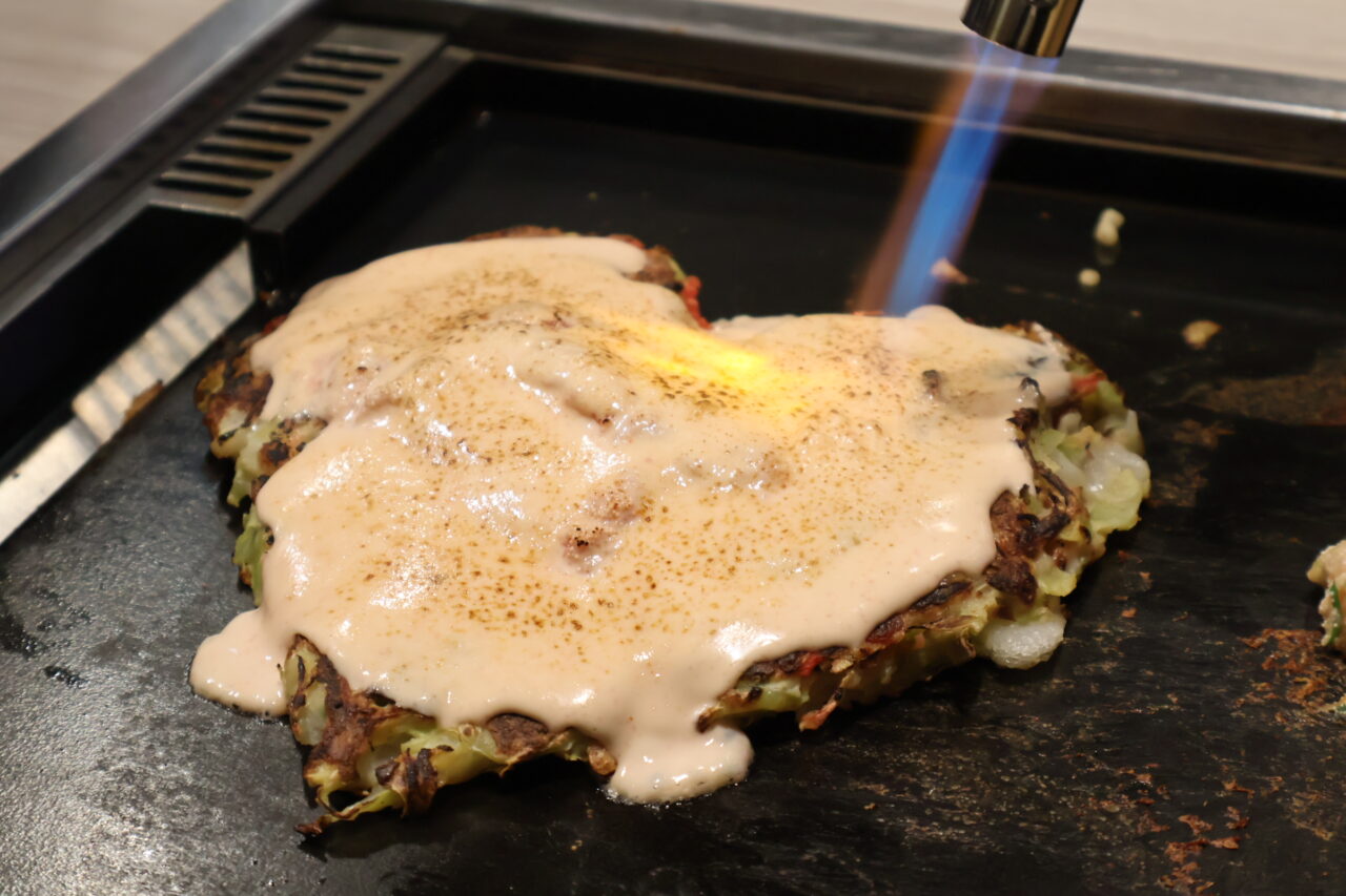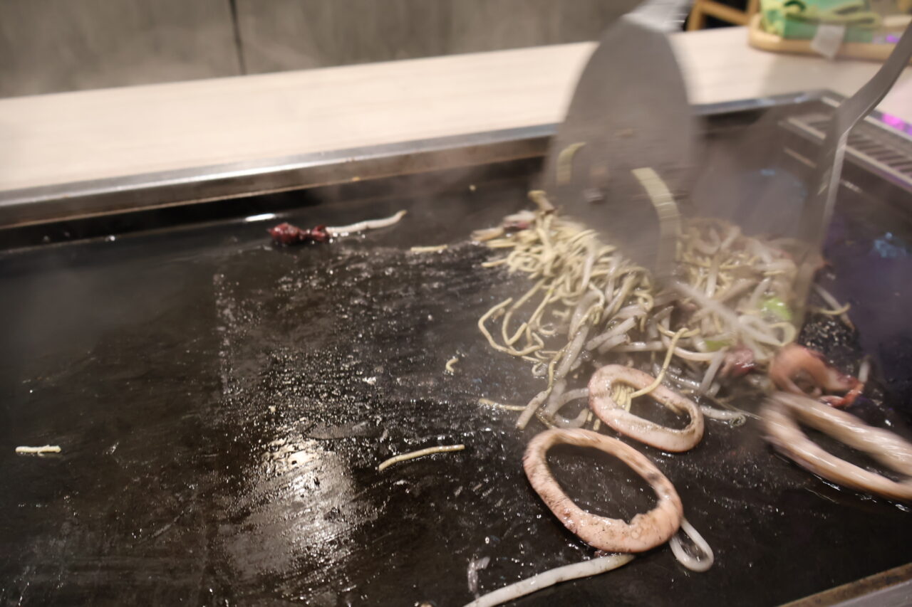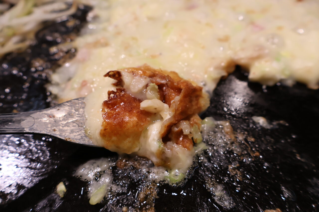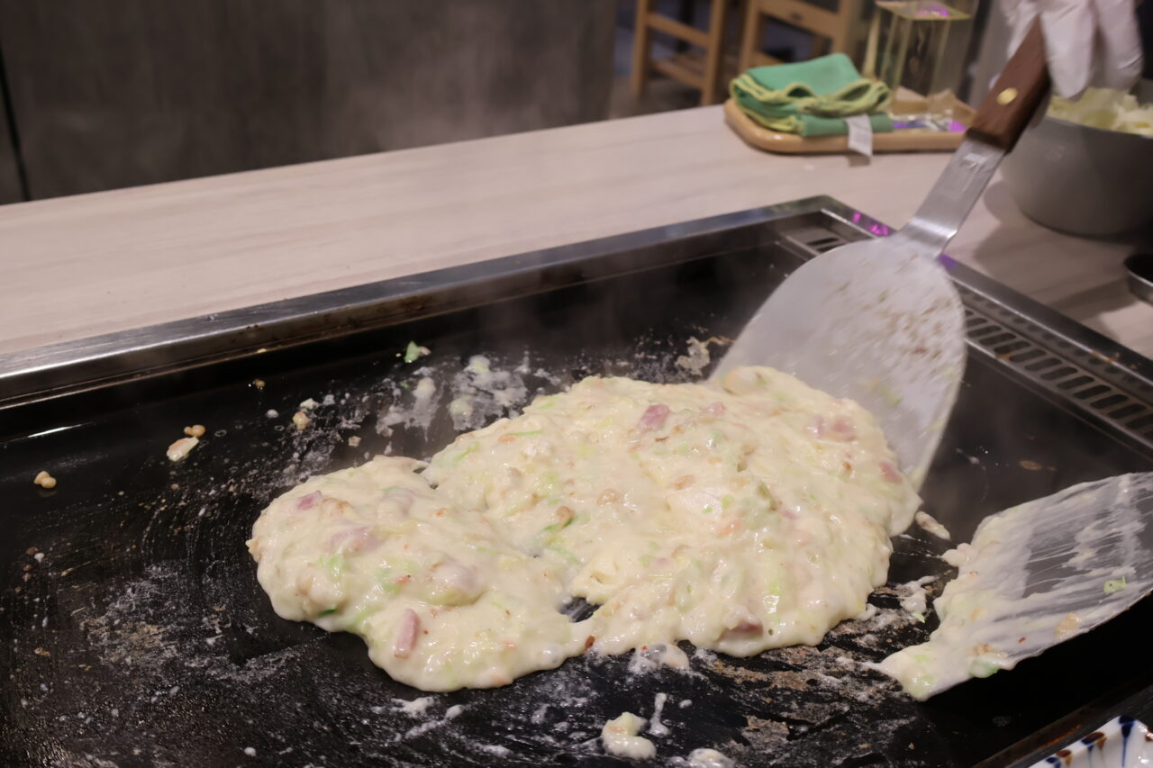 加熱が進むと、大量のモッツァレラとカマンベールチーズが贅沢に溶け出し、もんじゃ生地と絡み合って、まるで濃厚なリゾットのような変化します。鉄板の上でぐつぐつととろける様子は、見ているだけでワクワクしちゃいます!