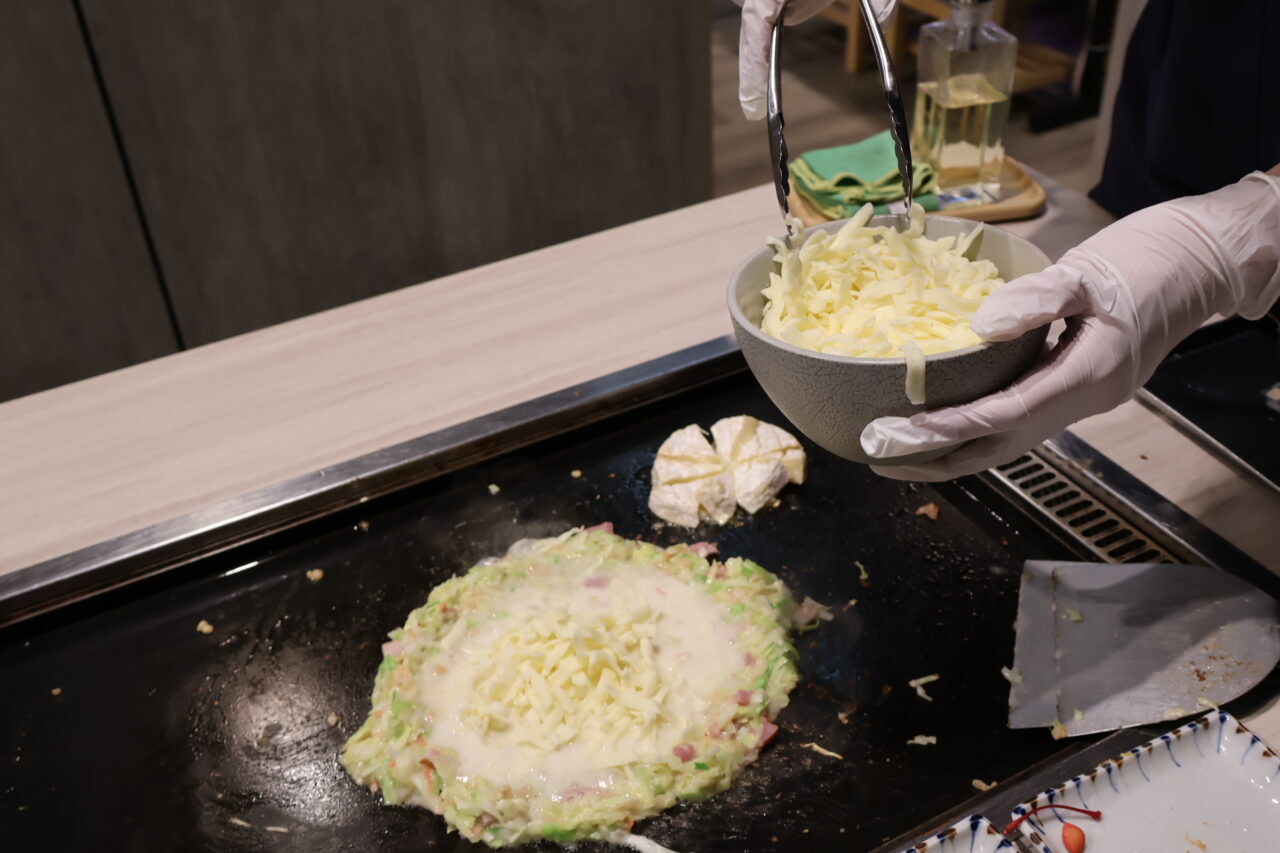 さらに、チーズ好きにはたまらない「沼るチーズ チーズかけ放題もんじゃ」(2,070円(税込))は、洋風創作だしをベースにしたもんじゃ生地の上に、スタッフの掛け声と共に、大量のモッツァレラチーズをかけていきます。