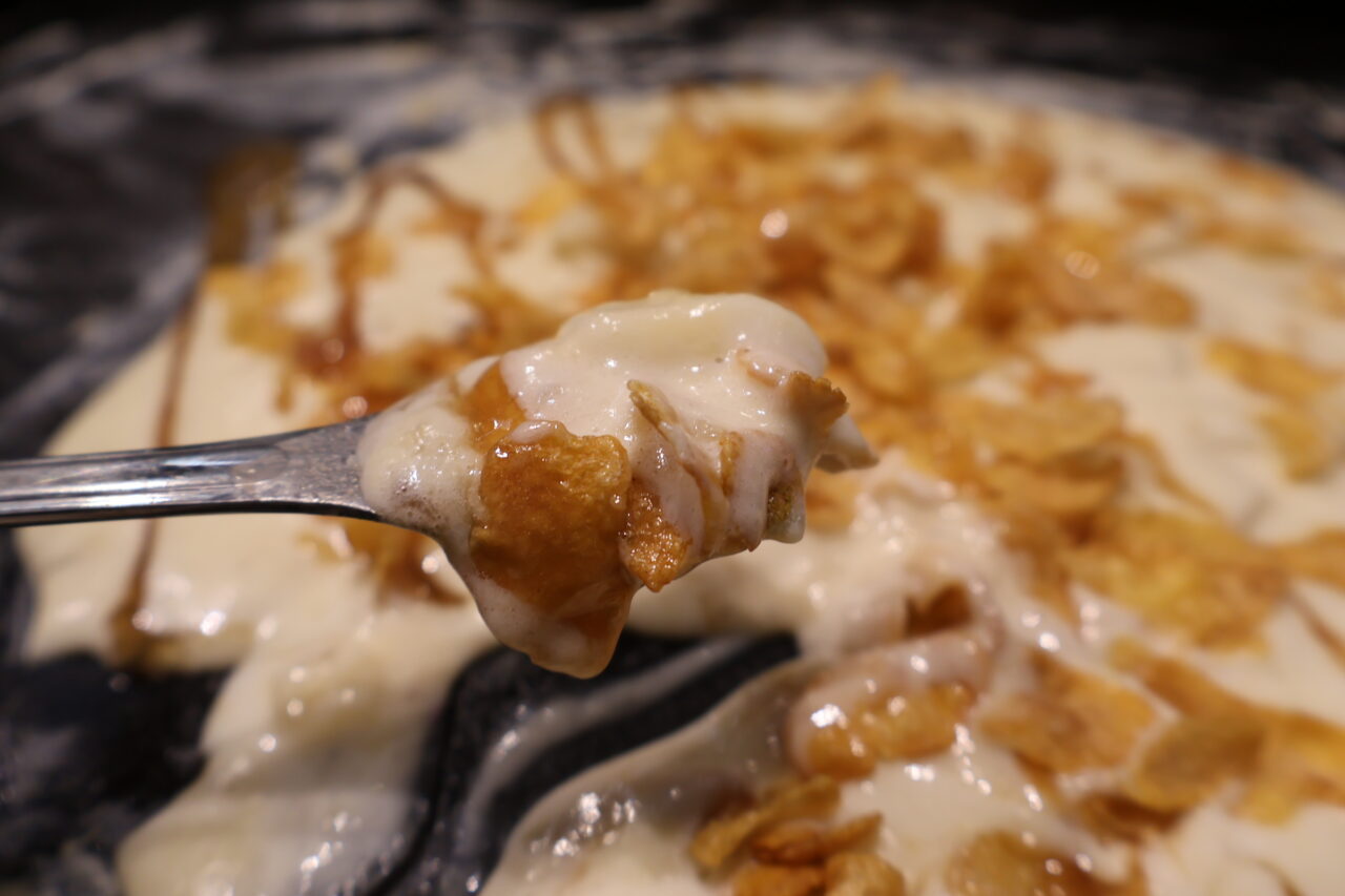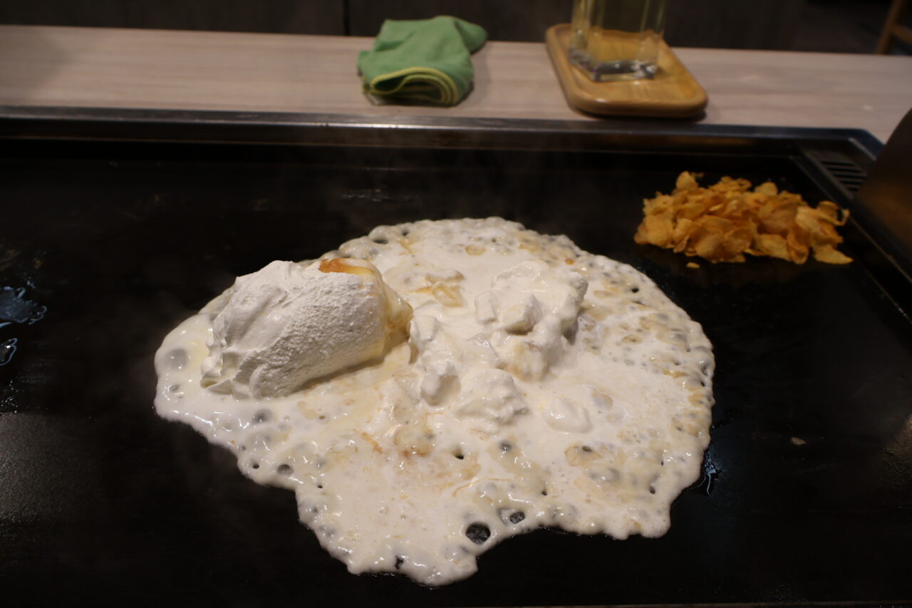 新感覚のデザートもんじゃは、オリジナル生地に、バニラアイス、キャラメル、もちなどが入っています。鉄板で焼くので「溶けちゃう?」ってしまったのですが、逆にもちもち&なめらかな絶品スイーツに変身!スタッフさんが混ぜてくれる時のバニラの甘い香りが、もう!たまりません!