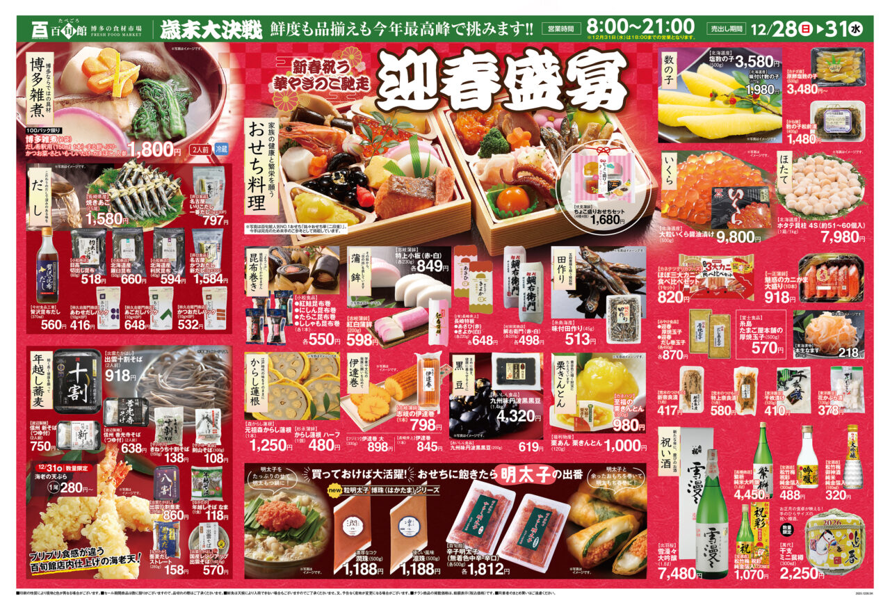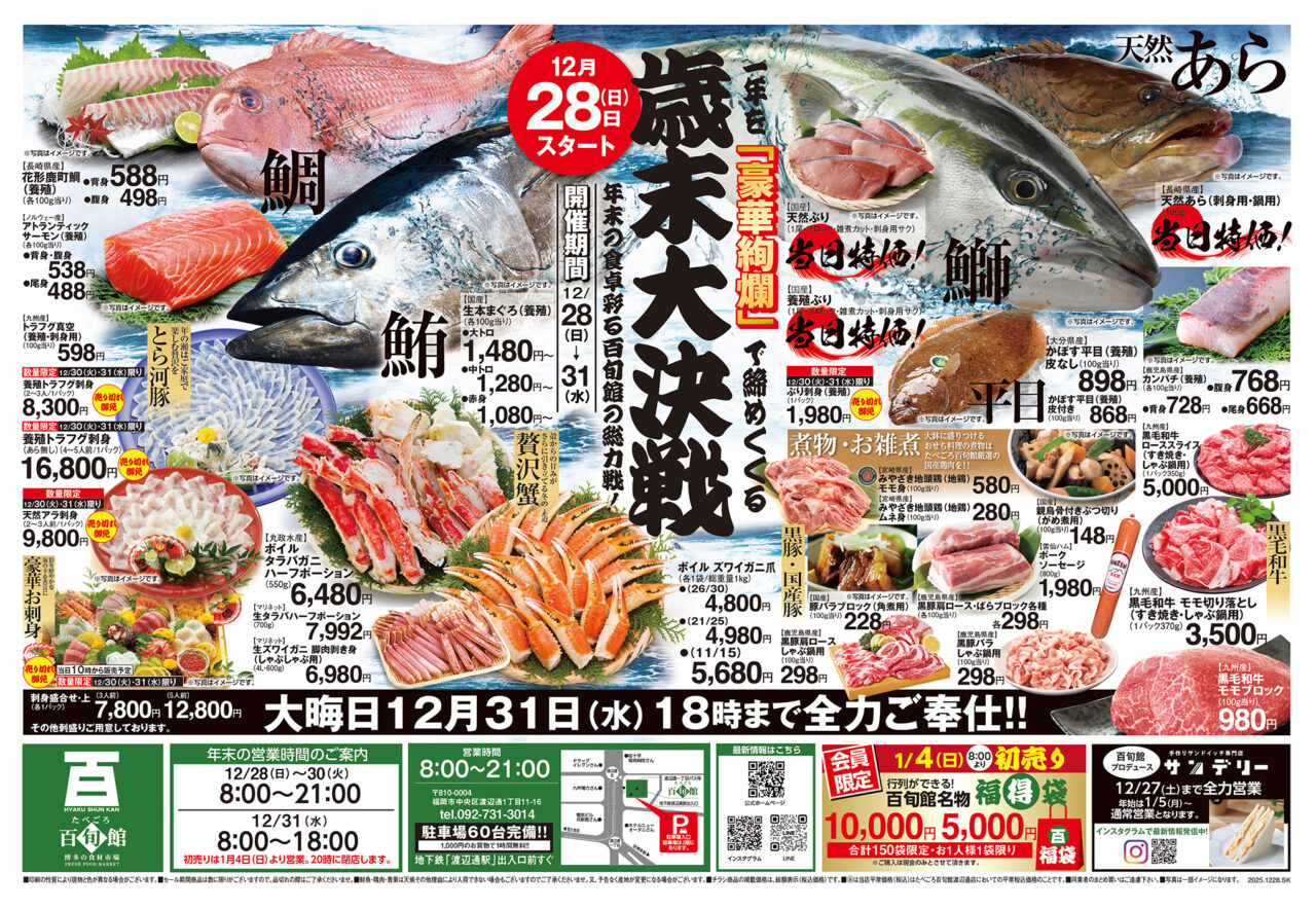 「たべごろ百旬館 渡辺通本店」で、鮮度も品揃えも今年最高峰の食材が、驚きの価格で大集結。2025年 12月28日(日)〜31日(水)の4日間限定。 「おっ!」と驚く感動の買い出し体験をぜひ!