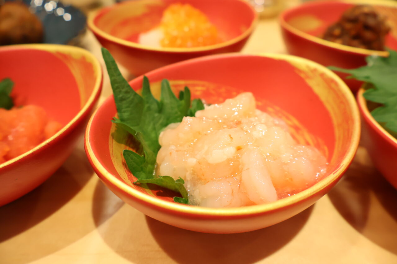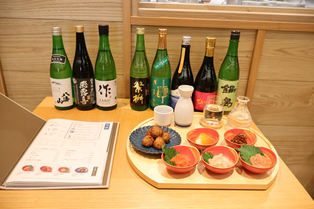 「銀鱈の西京焼き」や「鯛の胡麻ダレ」、そしてお酒が進む「甘海老の糀(こうじ)漬け」など、素材の良さを活かした酒菜が揃います。さらに、九州各地の地酒を中心としたアルコールメニューも用意されており、本格的な肴(さかな)と共に至福のひと時を過ごせます。