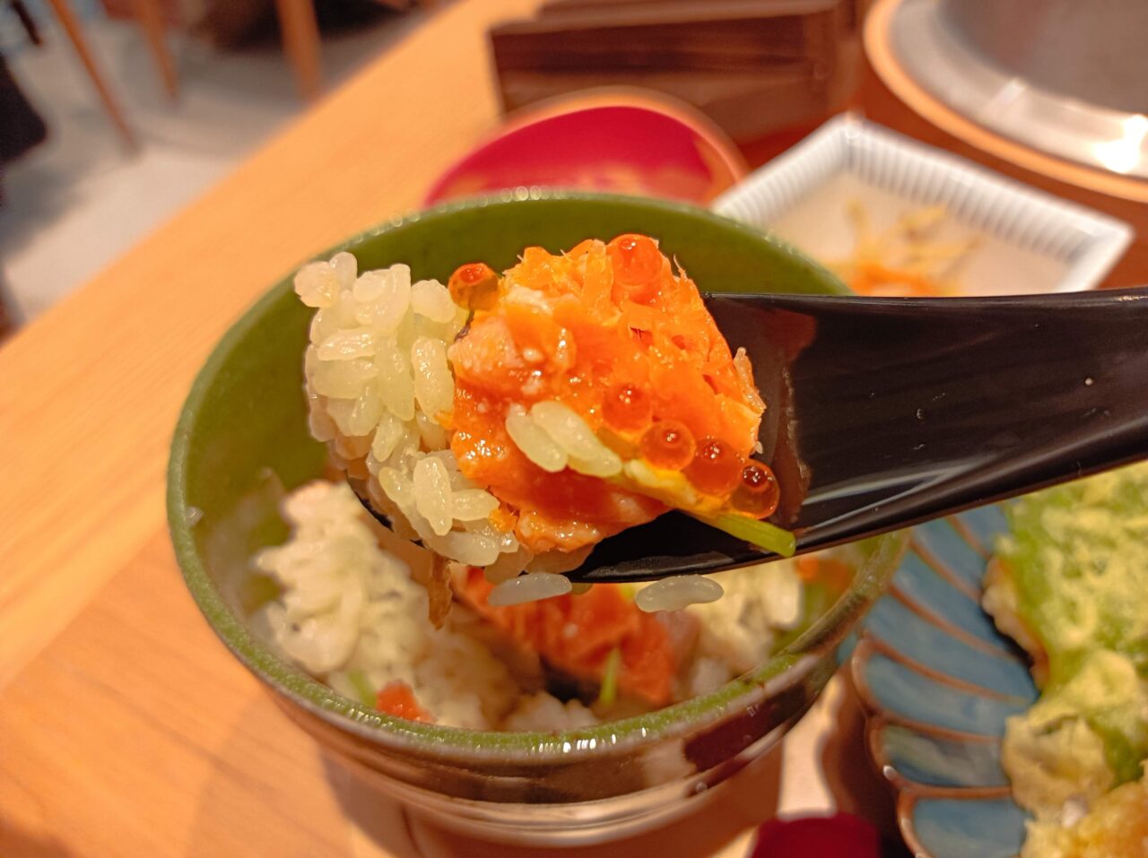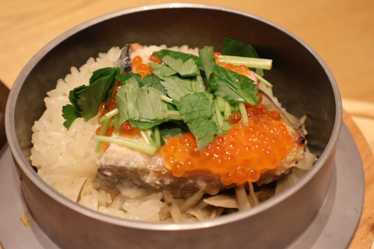 銀鮭の程よい塩加減とお出汁の効いたご飯が何とも言えない上品な美味しさ。そこにいくらのプチッとはじける食感がアクセントになって箸が止まりません。