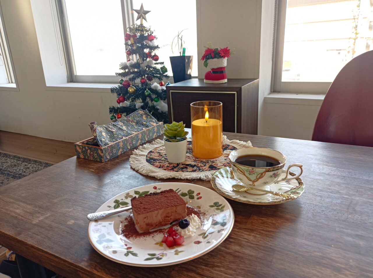 今回いただいたのは「本日のスイーツセット」。この日は、濃厚でなめらかな「チョコムースケーキ」でした。