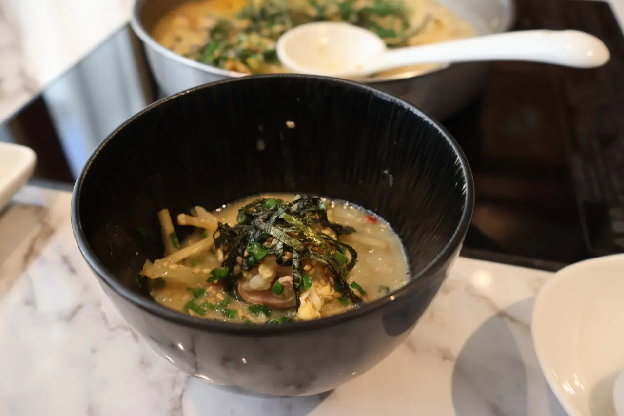 雑炊は自分たちでも作ることが可能ですが、スタッフの手によって美しく仕上げていただくことも可能です。野菜やもつなどの具材から出た旨味たっぷりの汁を吸ったご飯はパンチのある味で美味しい!トッピングの卵が全体をまろやかに包み込み、海苔とネギの風味が絶妙なアクセントを添えてくれます。