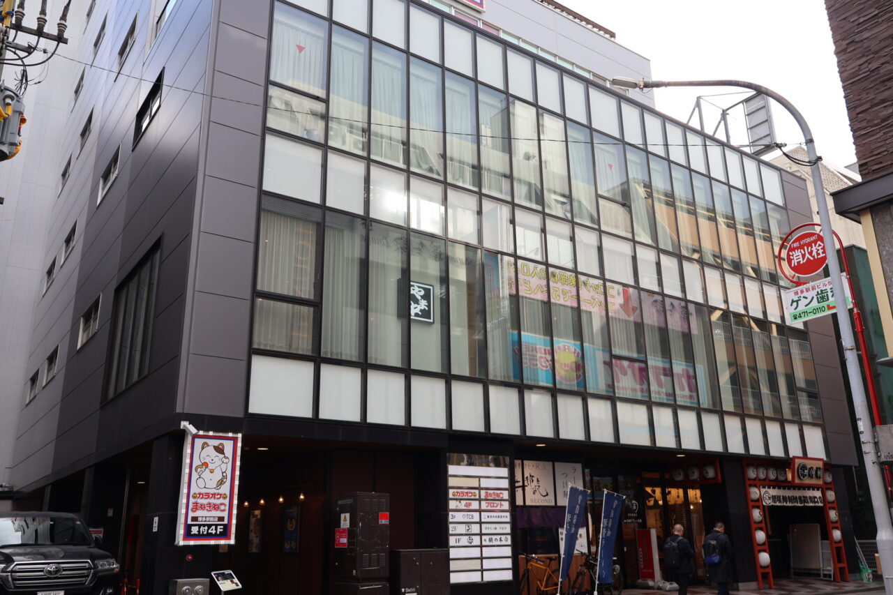 「博多もつ鍋 やま中 博多店」があるのは、JR博多駅筑紫口より徒歩約3分。ハカタベビルの2階にあります。