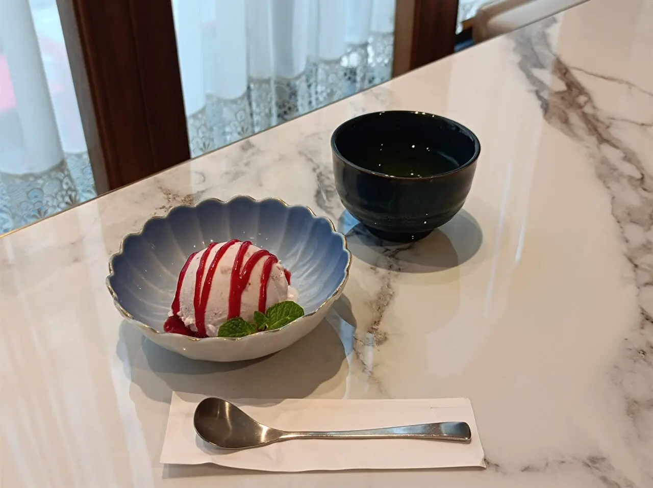 食後のデザートは、「あまおうアイス」「杏仁豆腐」「抹茶アイス」から選べます。実は、あまりの美味しさに熱々のもつ鍋を夢中で頬張ってしまい、少々口の中を火傷してしまった筆者。食後のデザートは「あまおうアイス」を選びました。