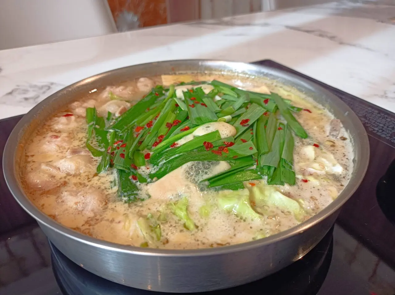 前菜だけで心満たされていた筆者の前に、満を持して登場したのが、迫力あふれる「もつ鍋」が運ばれてきました。