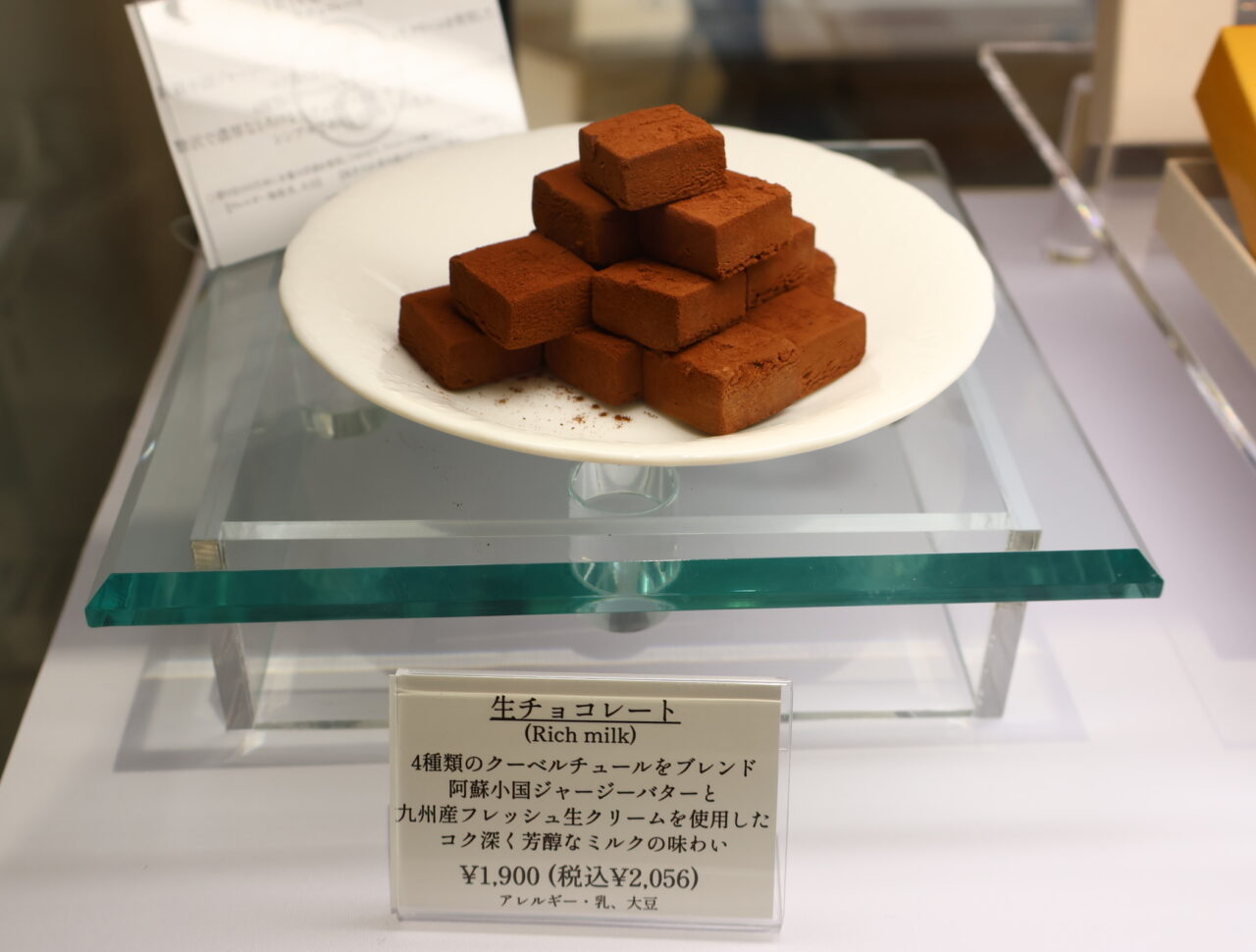 4種類のクーベルチュールをブレンドした生チョコレート(2,052円)は、阿蘇小国ジャージーバターと九州産フレッシュ生クリームを使用。コク深く芳醇なミルクの味わいが広がり、思わずうっとりしてしまう一品です。