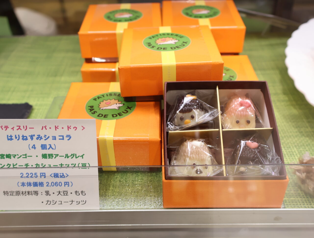 他に会場を歩いていると、あまりのかわいさについ二度見してしまった、バレンタインフェスタ初登場!福岡市南区高宮の人気店「パティスリー パ・ド・ドゥ」の「はりねずみショコラ」(1個、443円~)。
