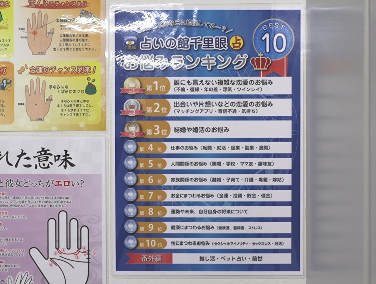 誰にも言えない恋愛の悩みや仕事の悩み、人間関係など、様々な悩みに寄り添ってくれます。どんな悩みであっても、決して否定せず、たとえ厳しい結果が出たとしても“どうすれば良くなるか”を一緒に考える千里眼のスタイルは、誰もがまた行きたくなる場所です。ぜひ足を運んでくださいね。
