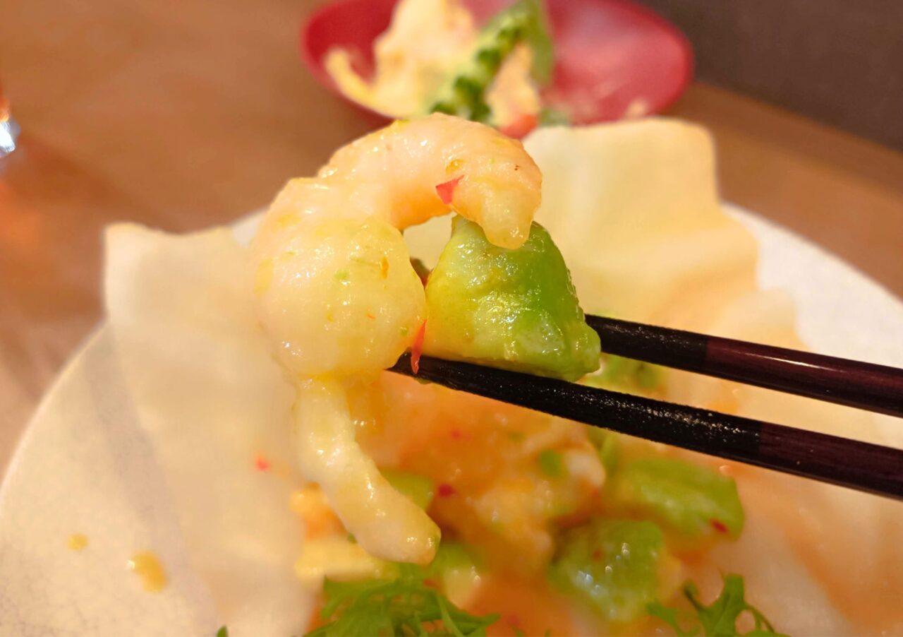 ぷりっぷりの海老とフレッシュなアボカドを贅沢に使った「海老とアボカドのチリマヨ」(900円)。甘酸っぱさとピリッとした辛味、そこにマヨネーズの濃厚なコクが加わり、ひと口食べればまさに「やみつき」になる味わいです。