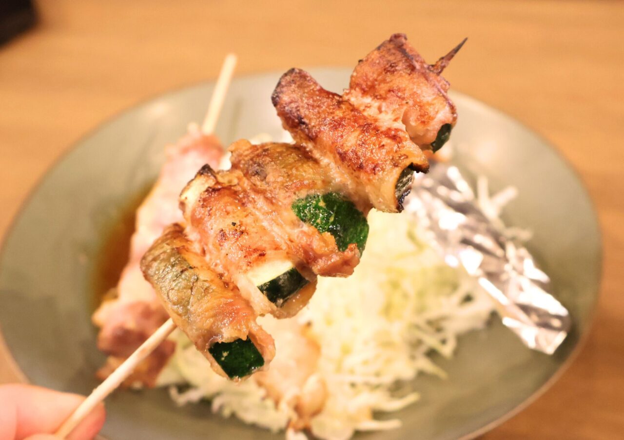 豚肉のカリッとした食感と、熱を通すことで甘みが引き出されたズッキーニの柔らかな食感が対照的な「ズッキーニ巻」(300円)。