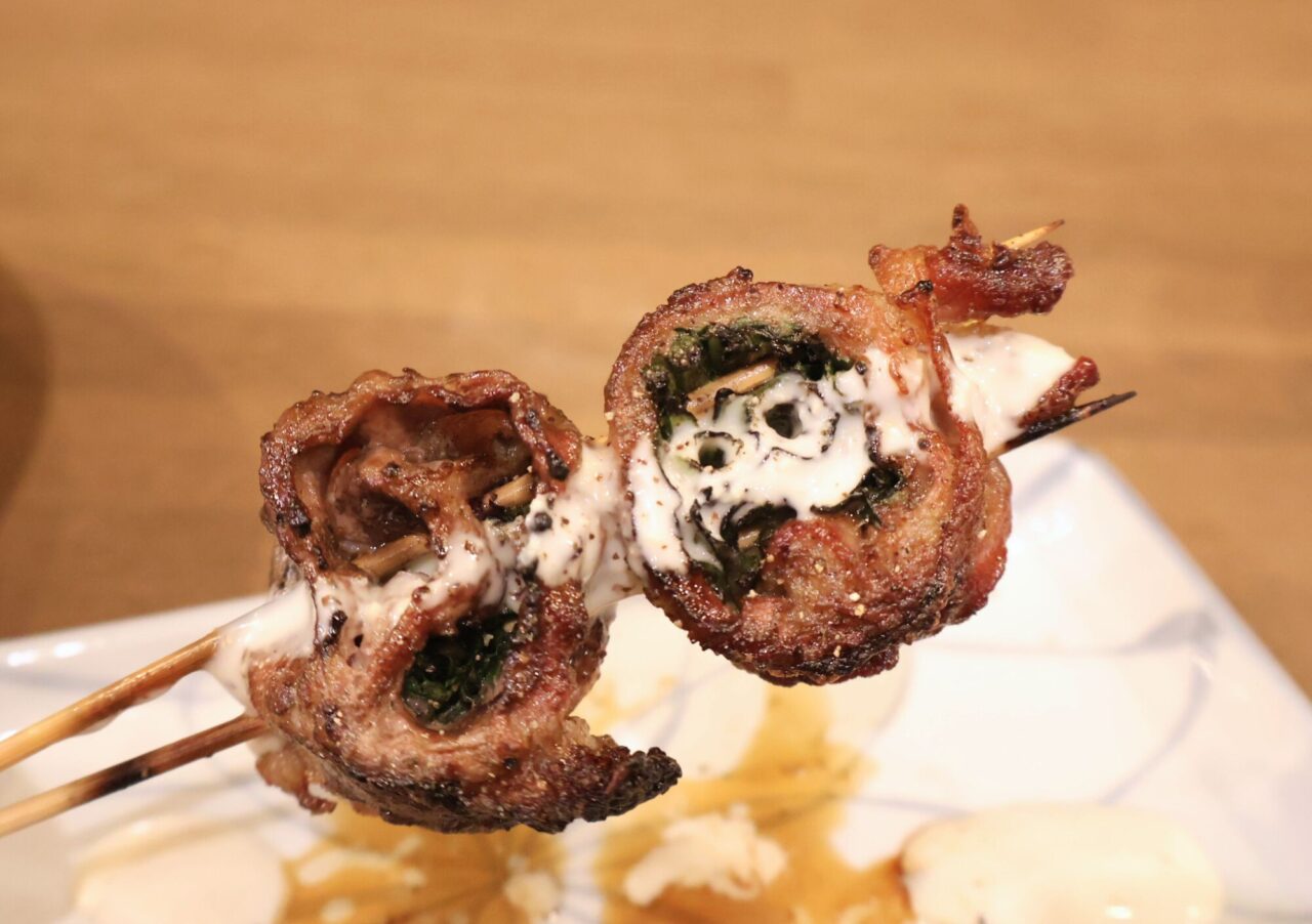 そして、ぜひ味わっていただきたいのが、春菊を牛肉で巻いた「牛春菊巻」(440円)。春特有の風味と食感が牛肉の旨味に、シーザードレッシングのような濃厚でクリーミーなソースがアクセントになっていて言葉にならない新食感です。